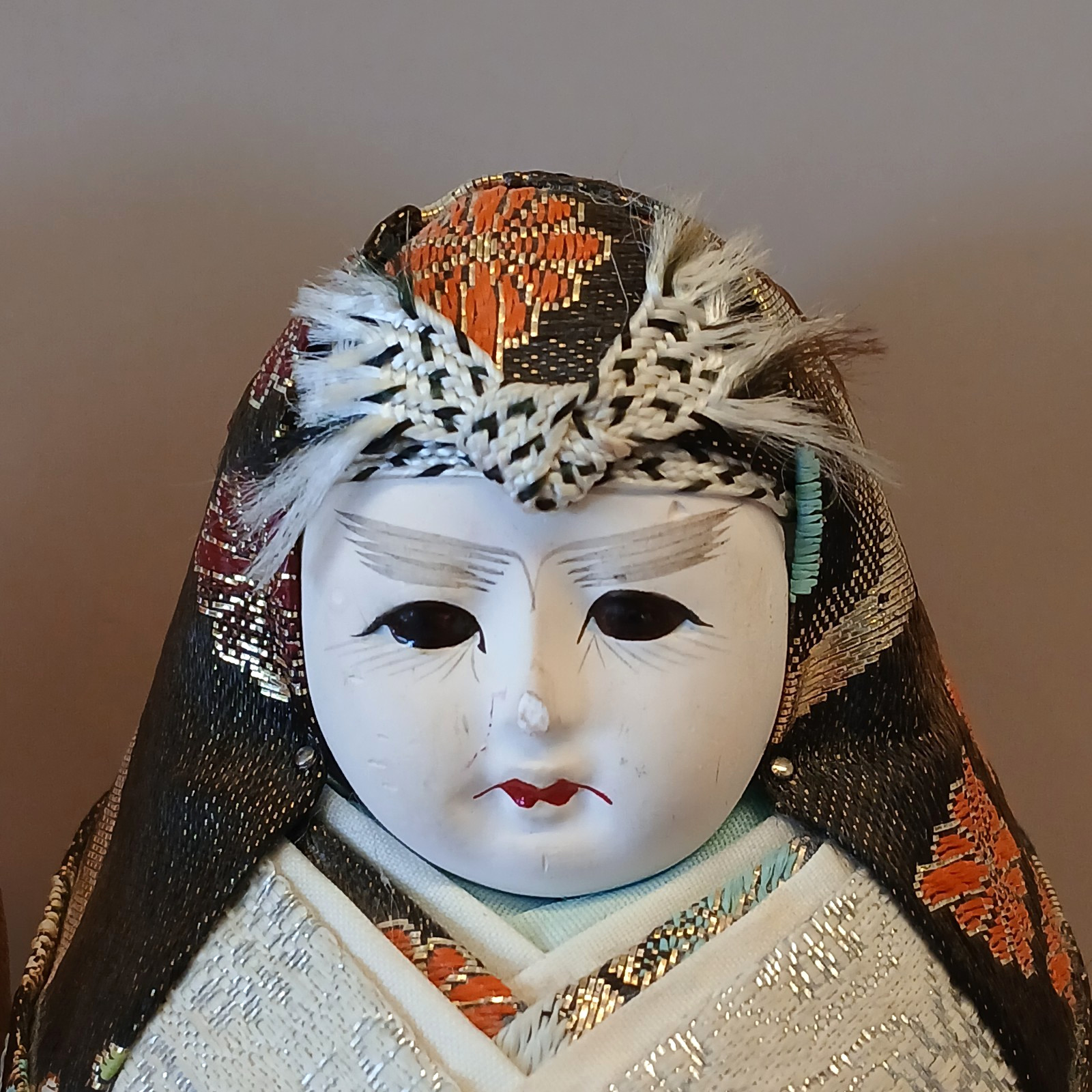 • Pair of Japanese Daruma Dolls, Male Female Handmade of Wood Brocade Fabrics
