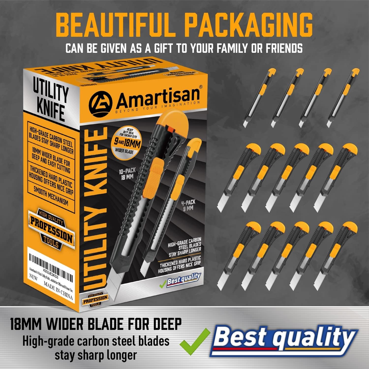 Amartisan 14-Piece Retractable Box Cutter, Utility Knifes for 18mm, Yellow