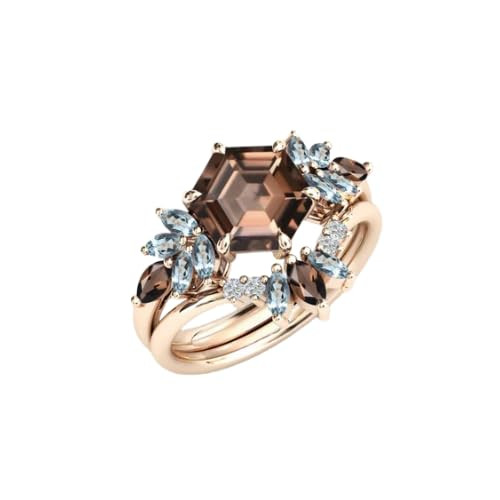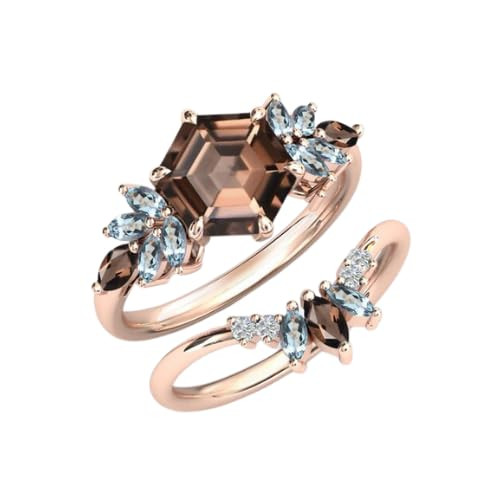 2Pcs Hexagon Cut 925 Silver Cluster Engagement Ring Set for Women Smoky Quartz