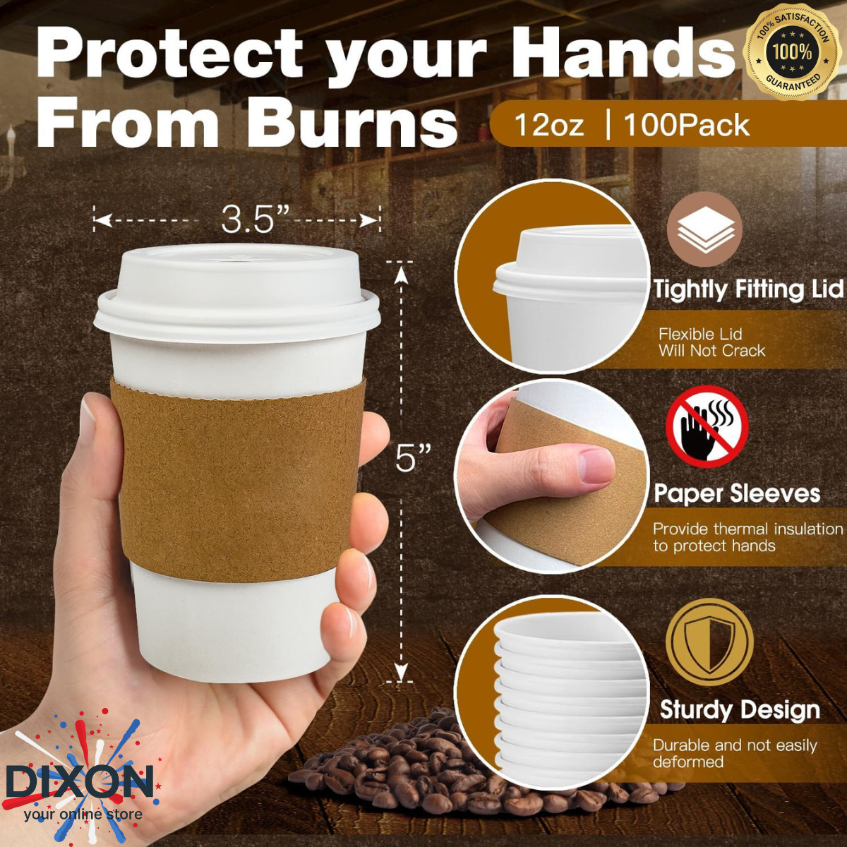 100 Disposable Coffee Cups with Lids Sleeves 12oz Paper Hot Drink Leak Proof