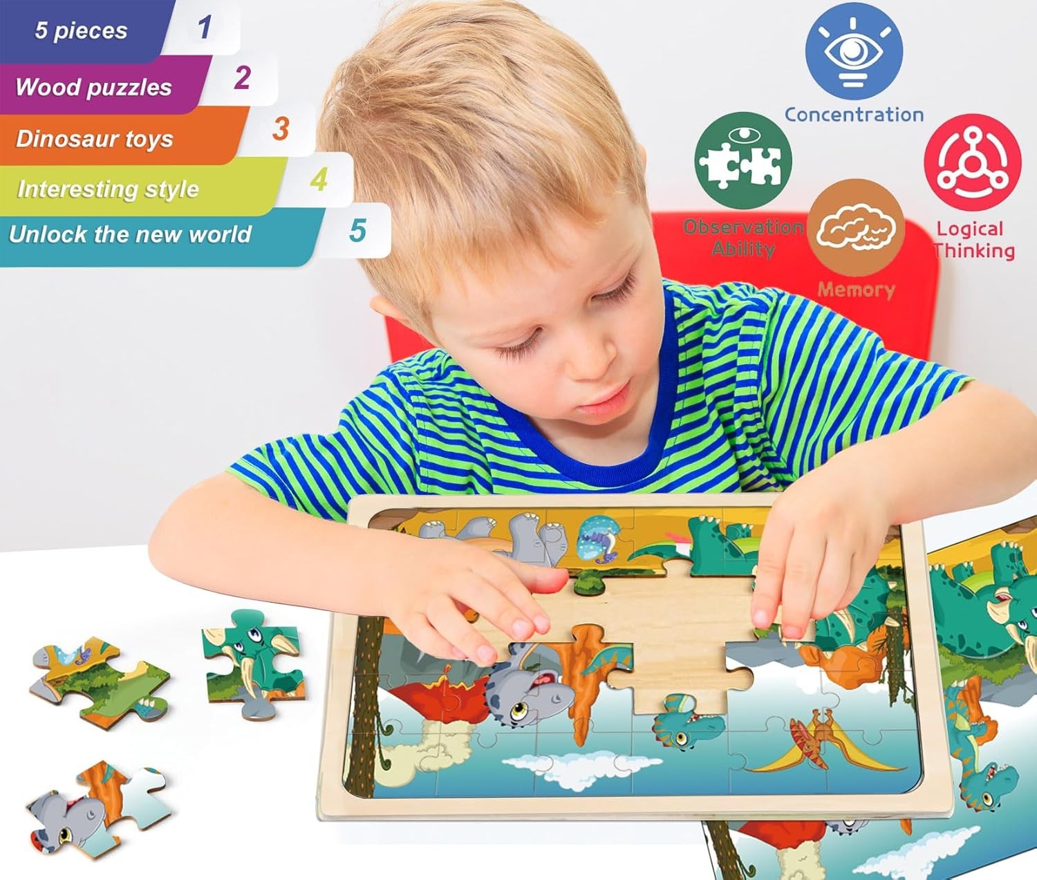 Wooden Puzzles Dinosaur Toys for Kids Ages 3-5, Set of 5 Packs with...