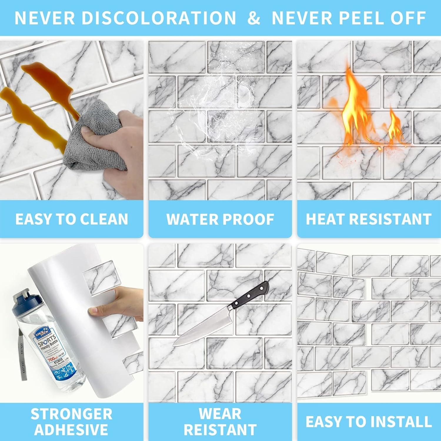 Особенности: Waterproof, Heat Resistant, Peel & Stick, Self-Adhesive, Easy to Clean, Odor-Free, DIY Installation, Anti-Scratch