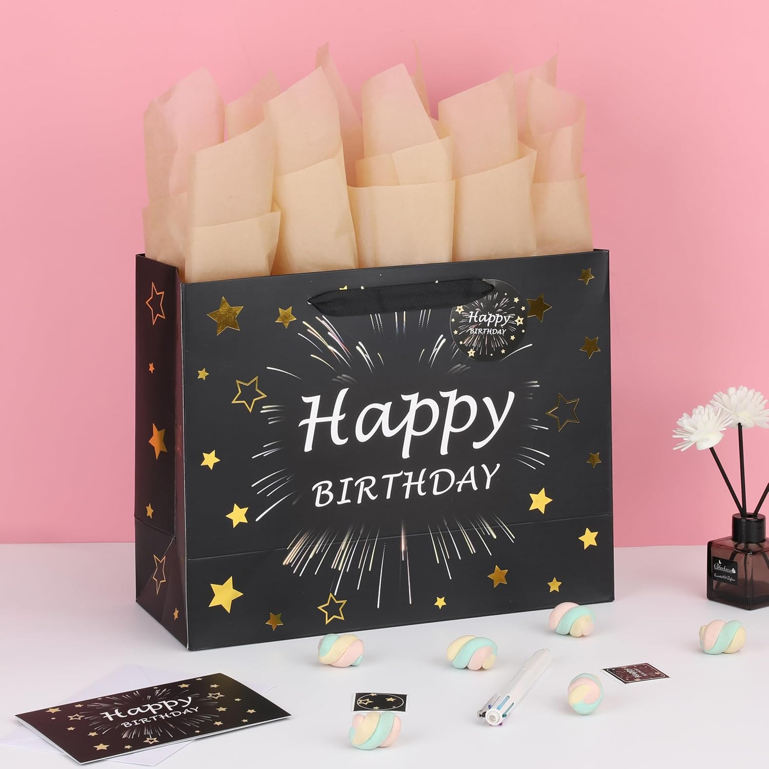 13 Large Black Gift Bag Set with Greeting Card and Tissue Paper Gold Foil Stars