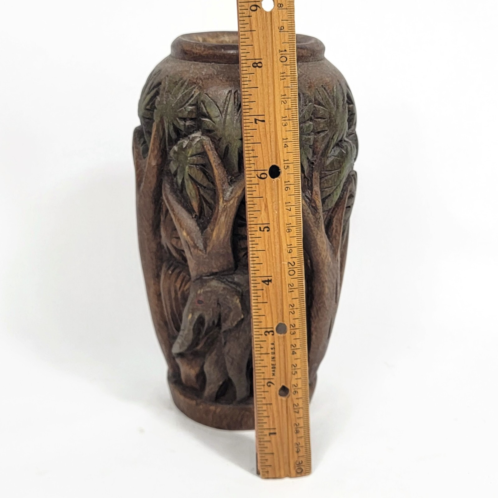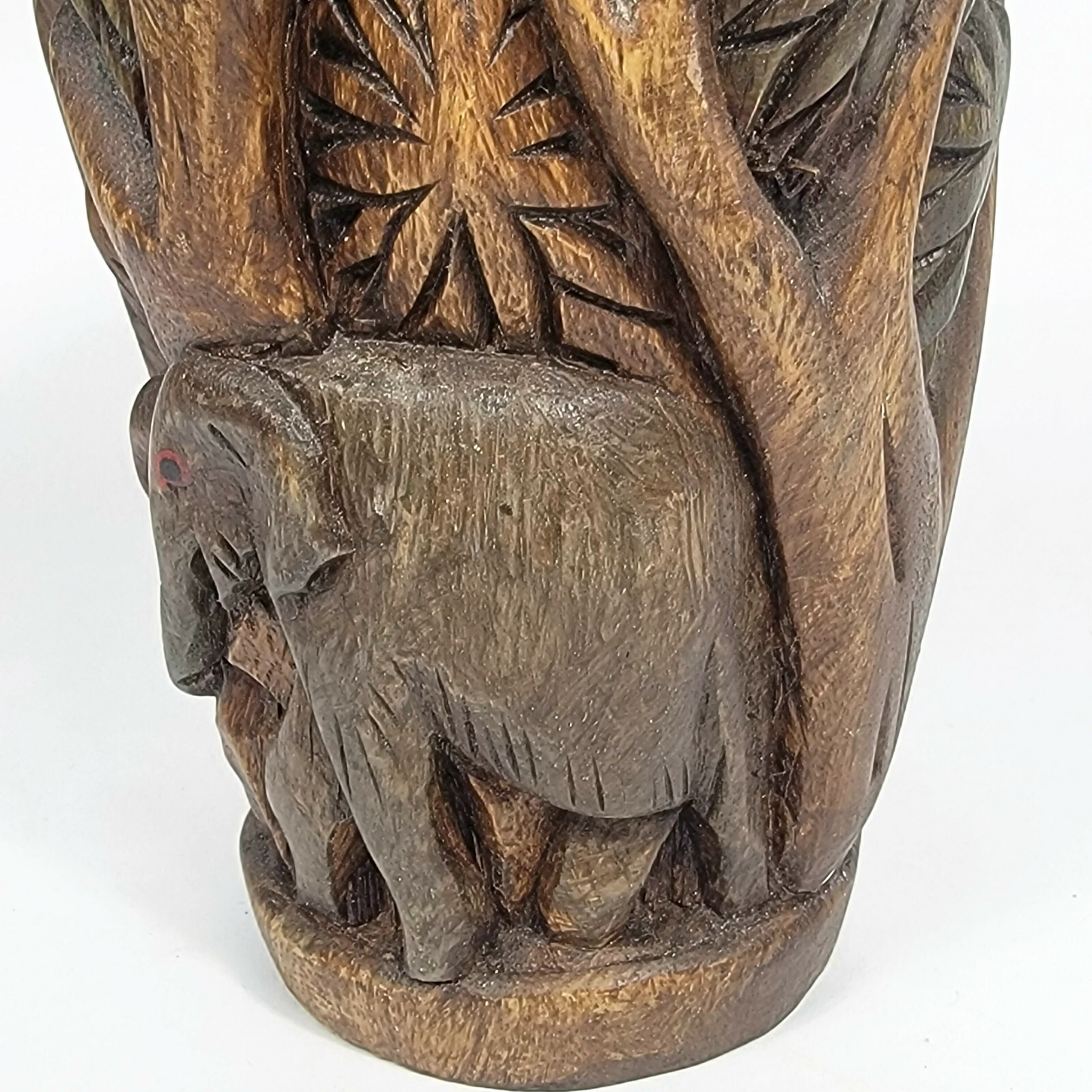 Vintage Wooden Hand Carved Elephants Vase 8.25" Tall Very Interesting Piece