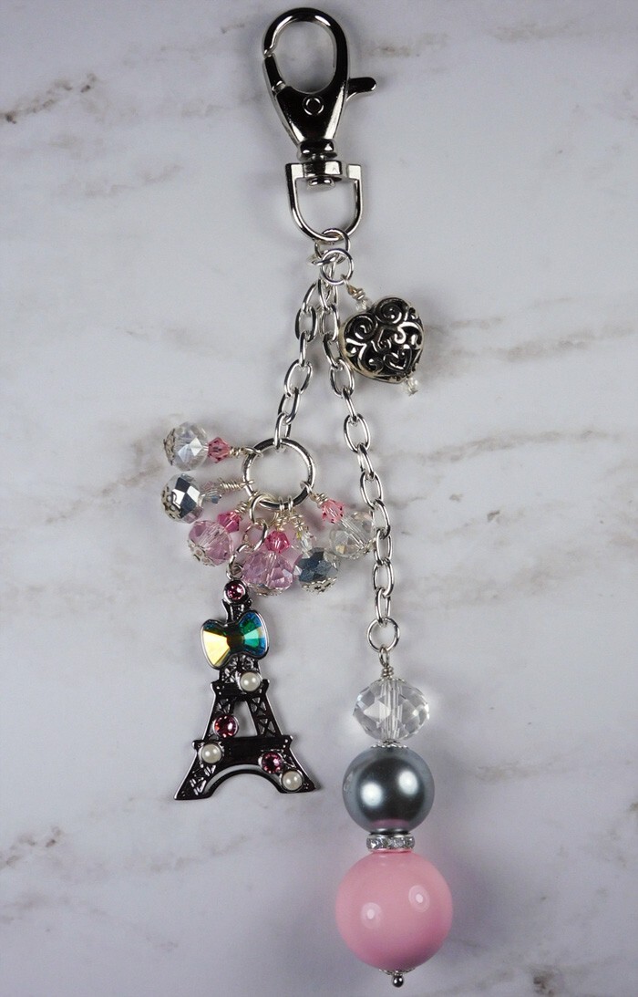 Eiffel Tower Paris Heart Purse Charm Bag Clip Crystal Beaded Handmade Pink New