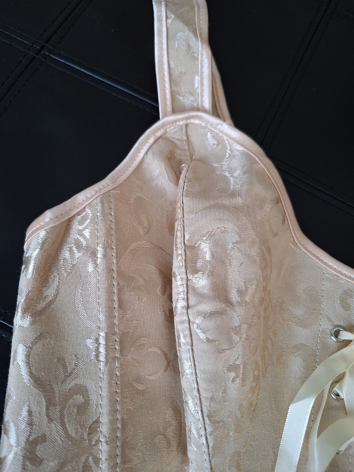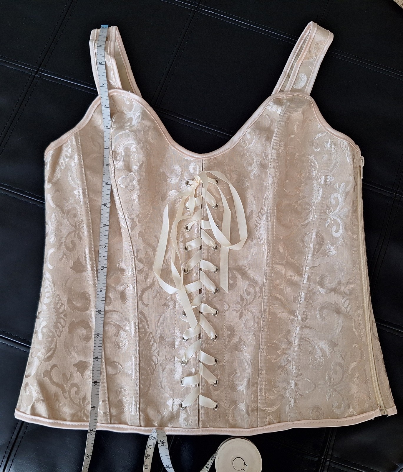 как выглядит NEW Beige Satin Jacquard Strap Bustier Ribbon Lace up Zipper Closure Corset L фото