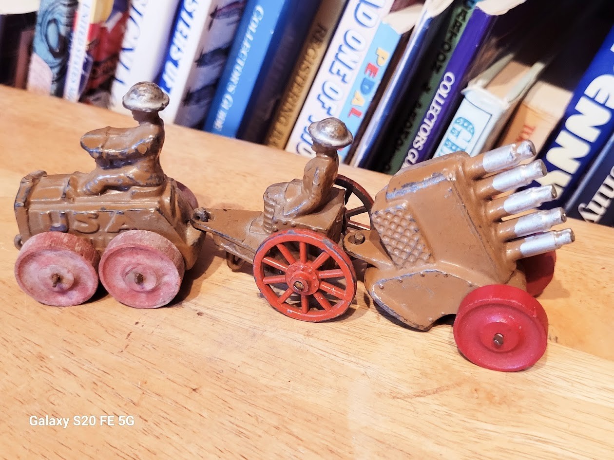 как выглядит NICE 1930s MANOIL 73 LEAD DIME STORE G.I. SOLDIER TRACTOR W/ ARMOR SHELLS LOAD фото