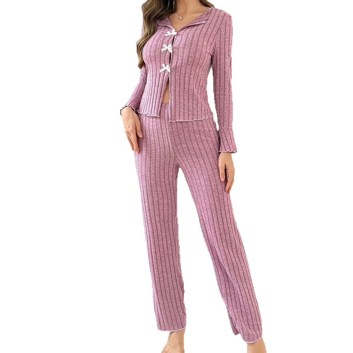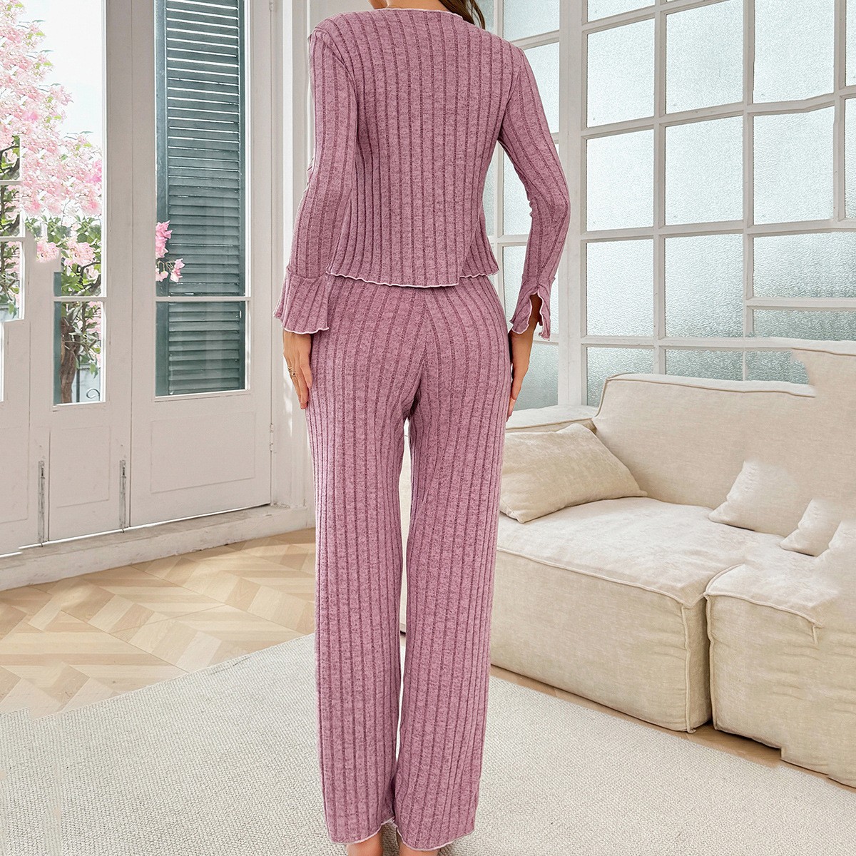как выглядит Pajamas for Women Set 2 Piece Lounge Sets Ribbed Knit Soft Long Sleeve Tops Pant фото