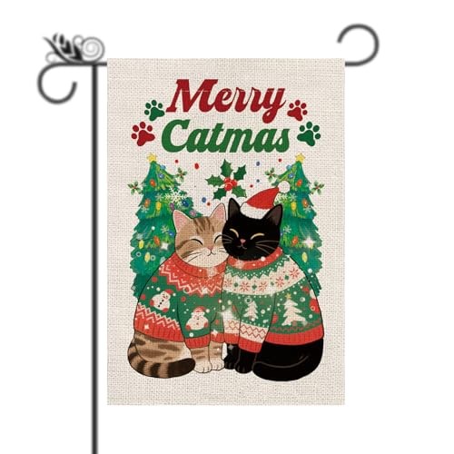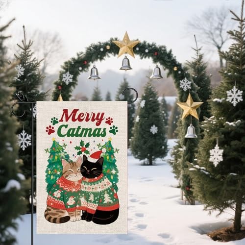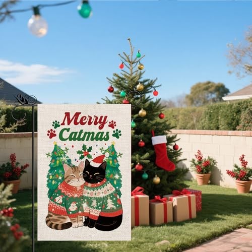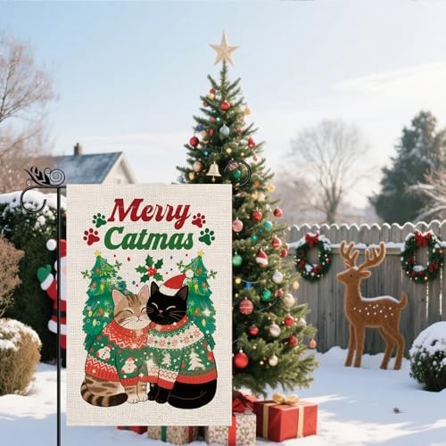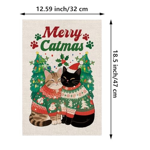 Merry Christmas Garden Flag Christmas Cat Decor Winter Vertical Burlap Double