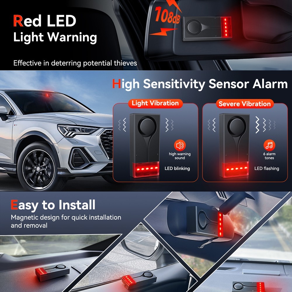 Wireless Car Alarm System 108dB,Sound Light Alert Anti-theft Vibration Sensor
