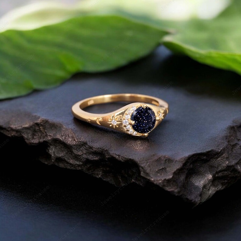 как выглядит Blue Sandstone Moon Star Ring Gold Plated Celestial Jewelry Gift for Her фото