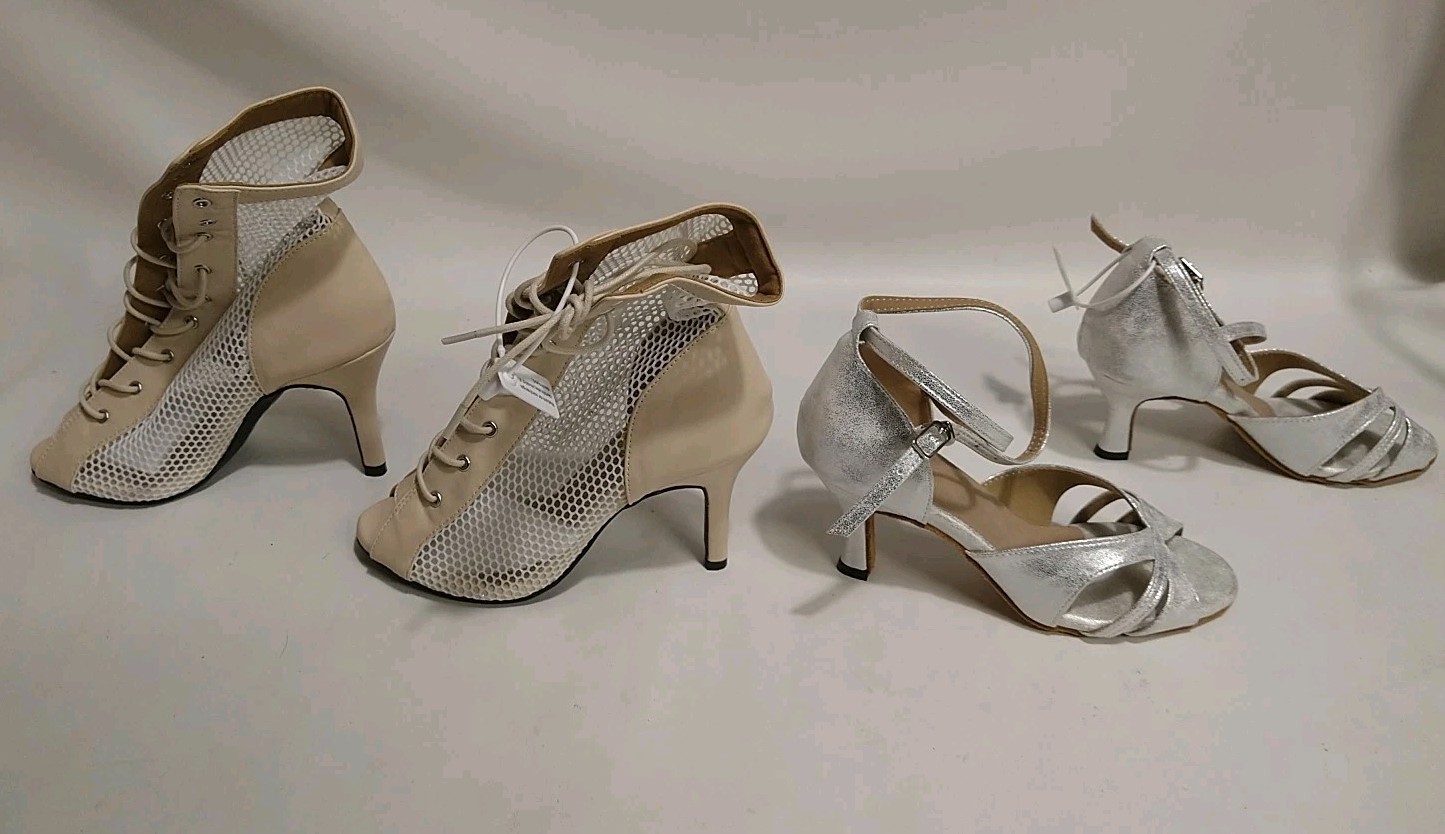 2 Women's Ballroom Latin Dance Shoes Open Toe High Heels Silver Cream US Size 6