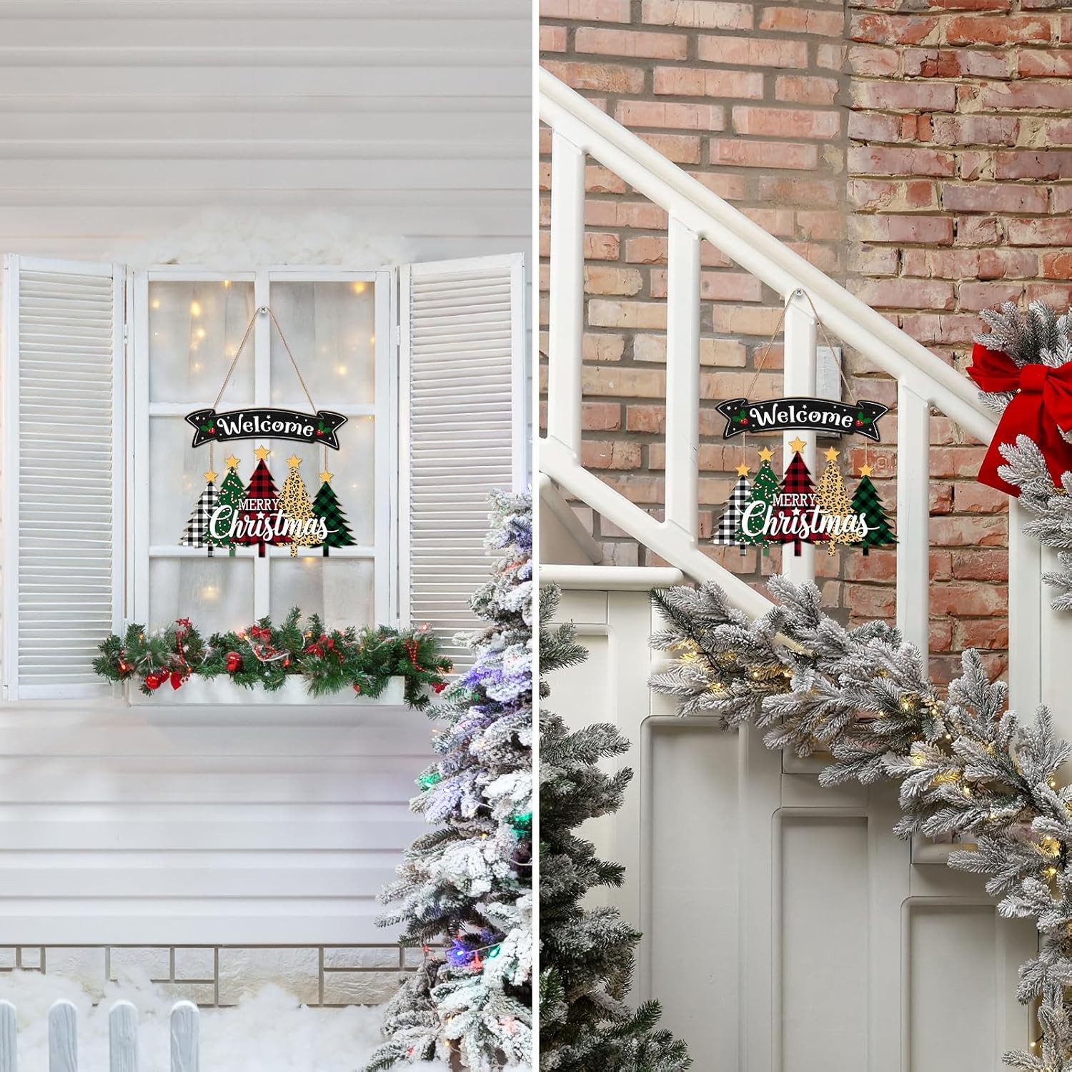 Merry Christmas Wreath Hanging Sign For Front Door, Wooden Welcome Tree