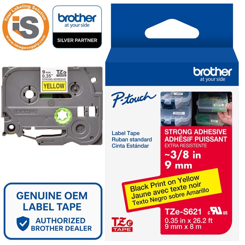 Genuine Brother TZe-S621 Strong Adhesive Black on Yellow 9mm 3/8 Label Tape