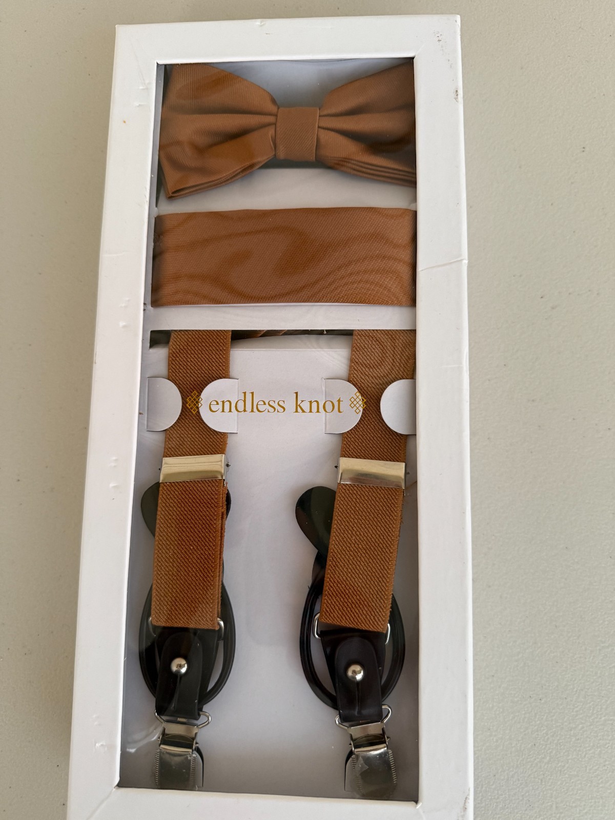 endless Knot elastic adjustable suspenders with bow tie/Brown