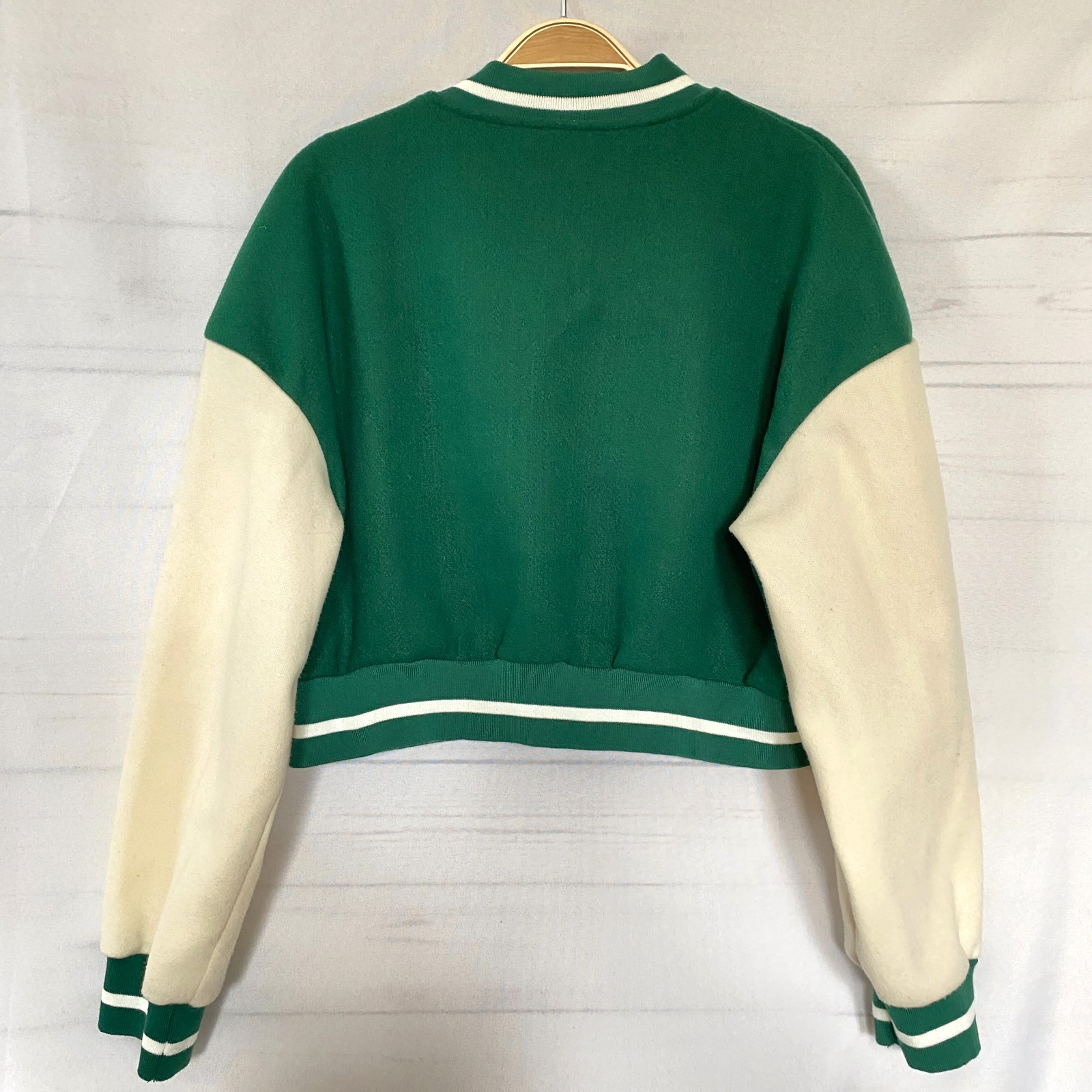 как выглядит SHEIN Varsity Letterman Bomber Jacket Women M Green Cream Snap R Patch 80s фото
