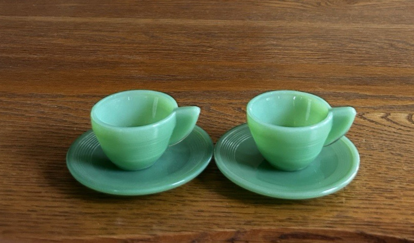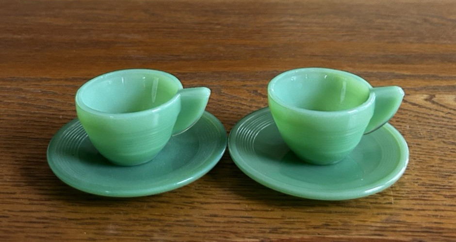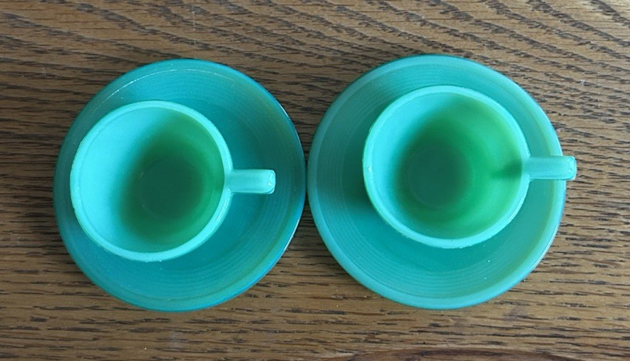 как выглядит AKRO AGATE JADE GREEN CHILDS TEASET 2 CUPS SAUCERS, CONCENTRIC RINGS 1930s фото