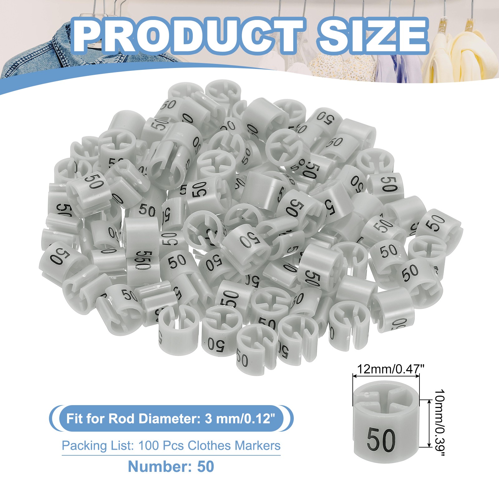 100 Pcs Clothes Hanger Marker Number 50 Tag Fit 3mm Rod Garment Size Tag Gray