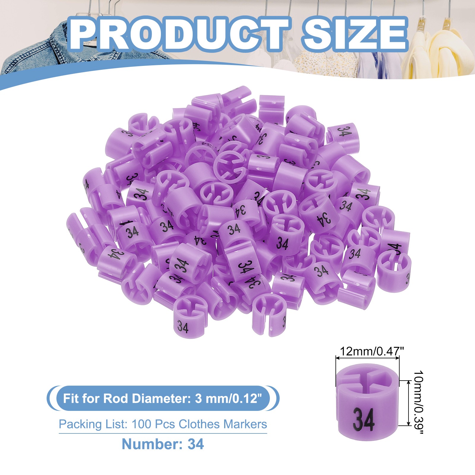 100 Pcs Clothes Hanger Marker Number 34 Tag 3mm Rod Garment Size Tag Purple Pink