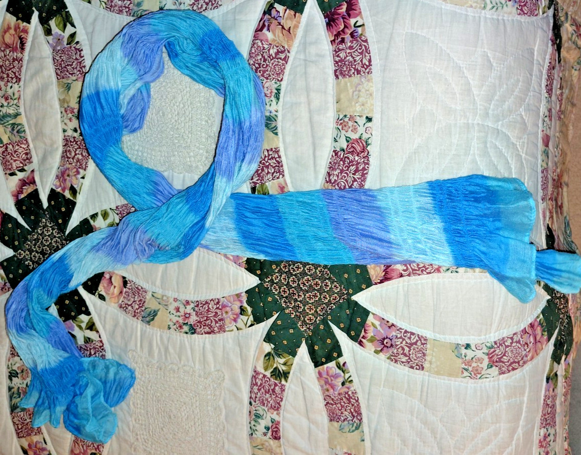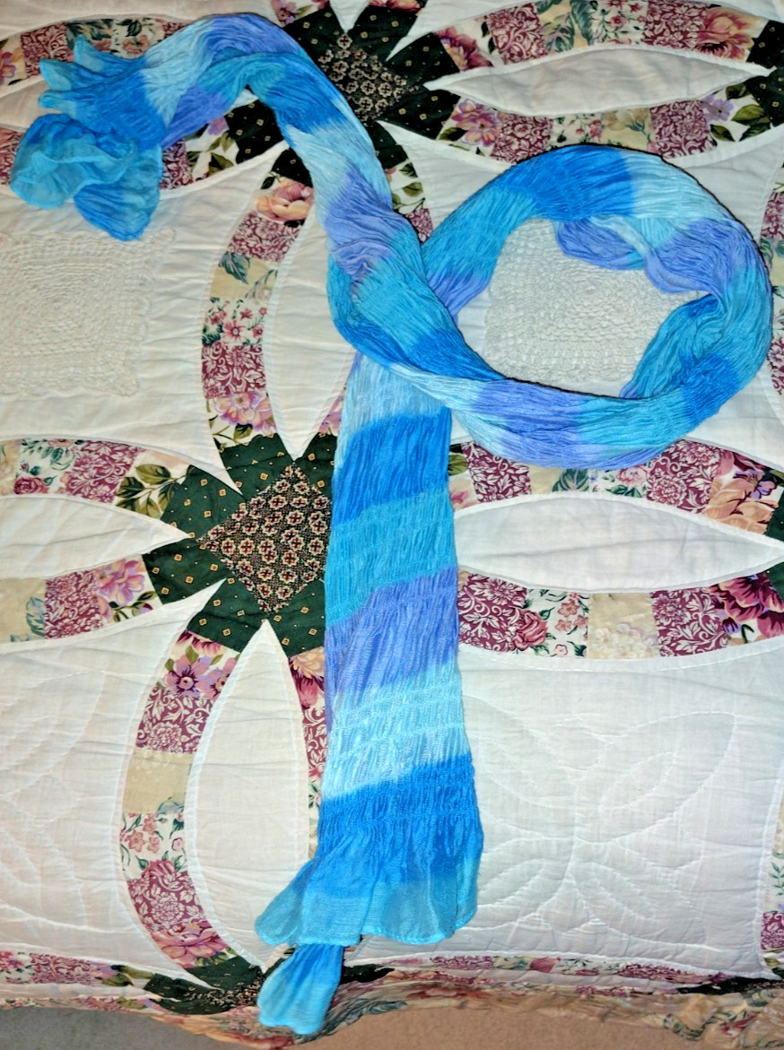 VINTAGE SMOCKED SCARF BLUE AQUA LAVENDER STRIPE RUFFLED 70s 80s ORIG disco