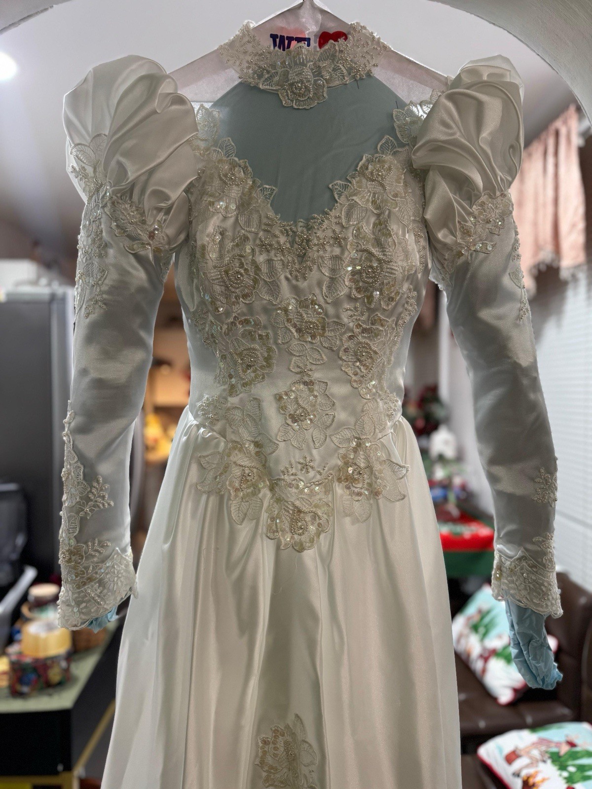 как выглядит Union Made Vintage 80s Ivory Satin Sequin Lace Long Sleeve Wedding Dress sz 6 фото