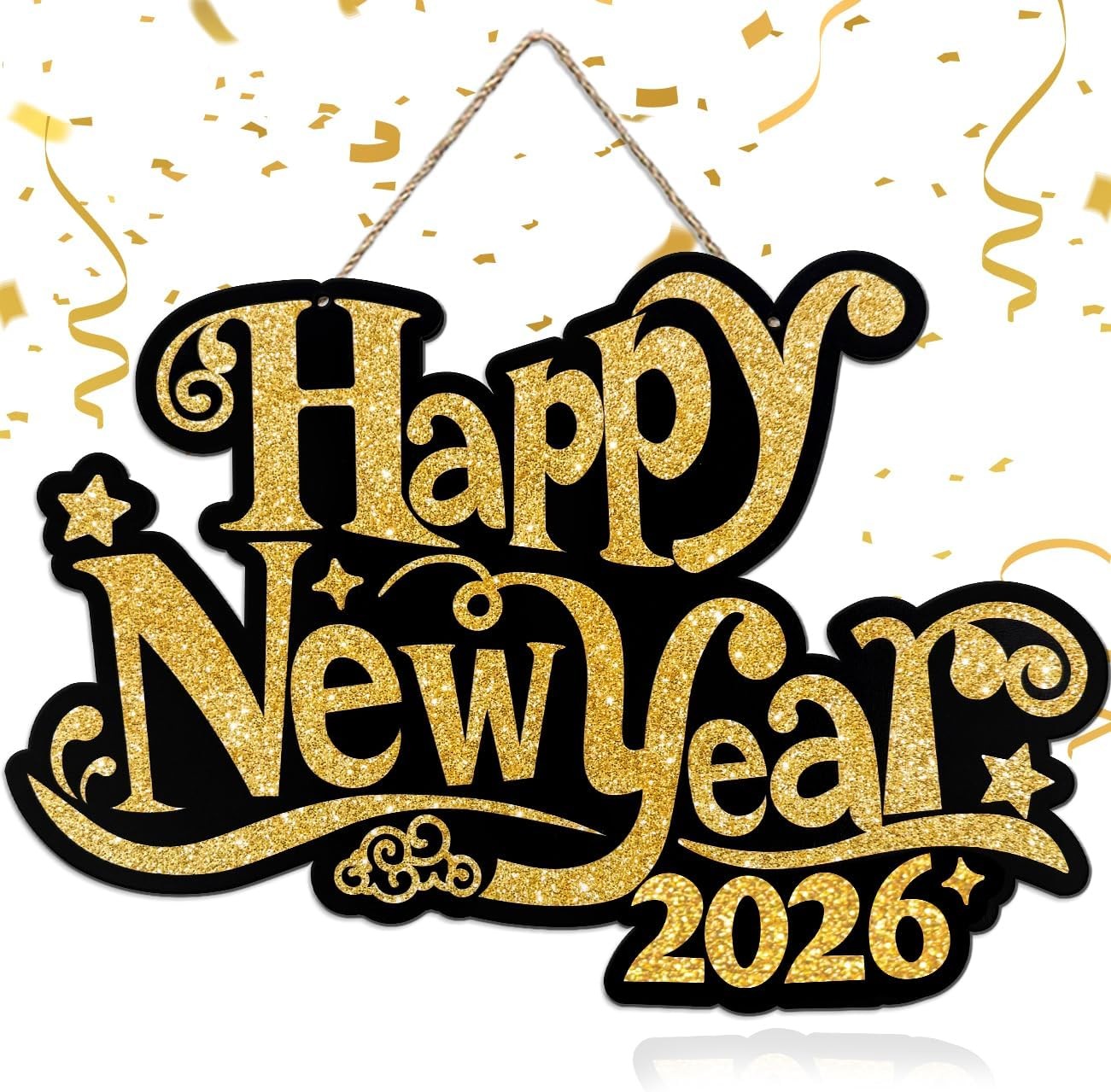 Happy New Year 2026 Black and Gold Wooden Hanging Sign Decorations, 2026