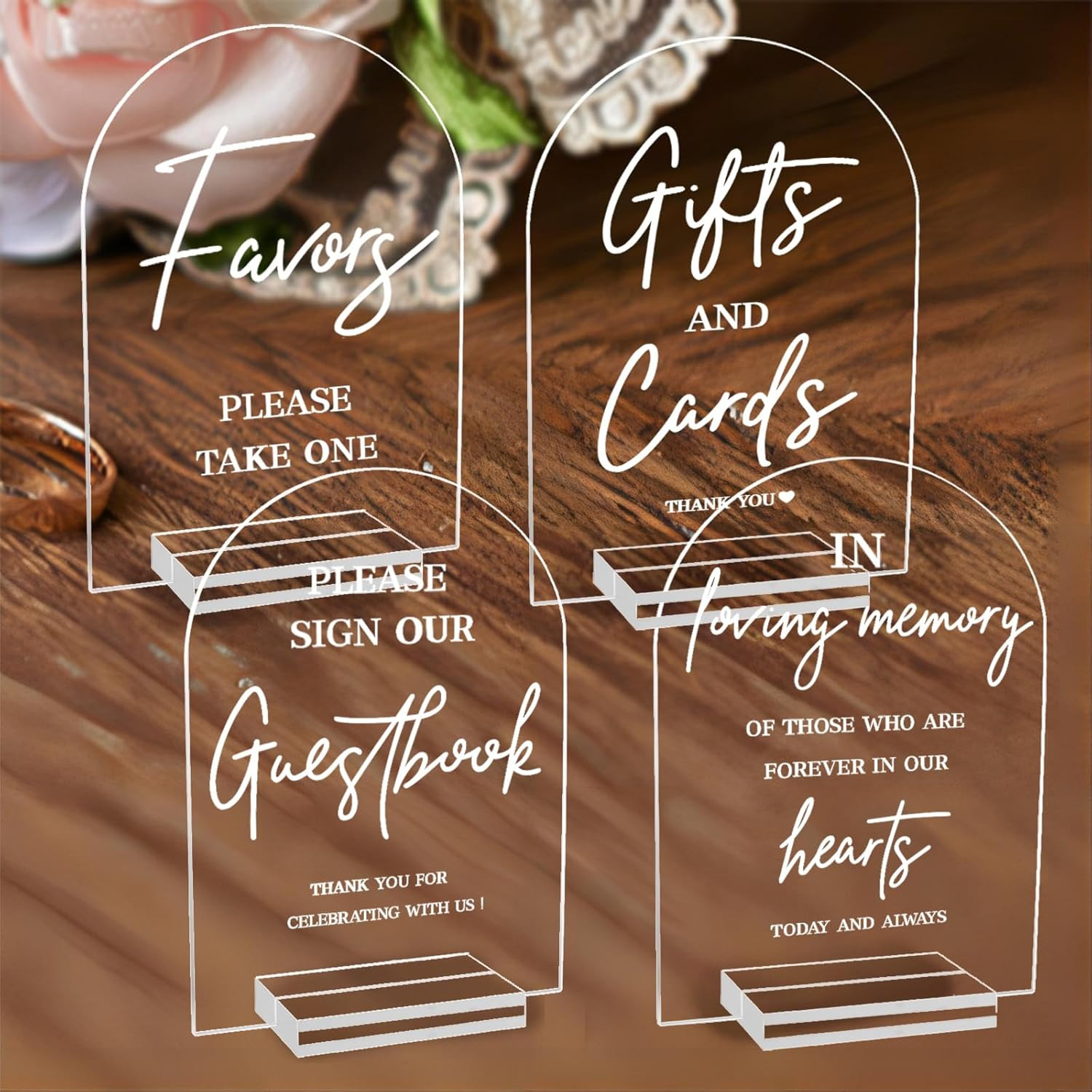 Included Components: 4) Acrylic Wedding Signs with Holders
