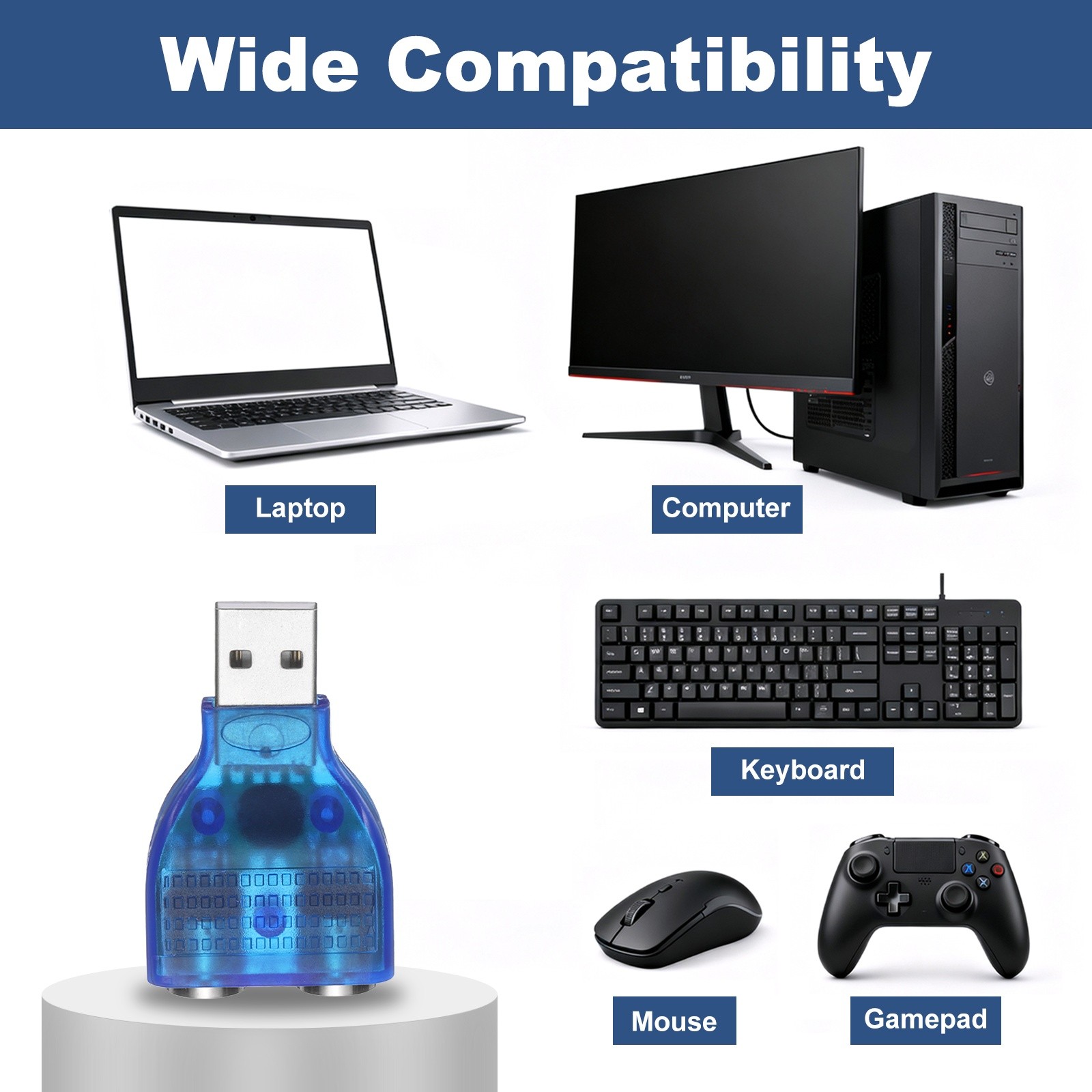 4 Pcs USB to PS/2 Adapter, Plastic USB A Male to Dual PS/2 Female Converter Blue
