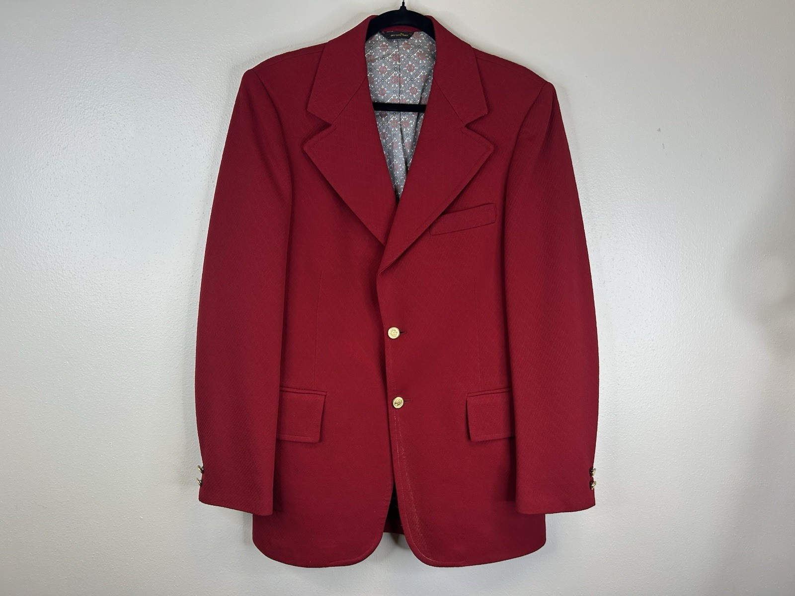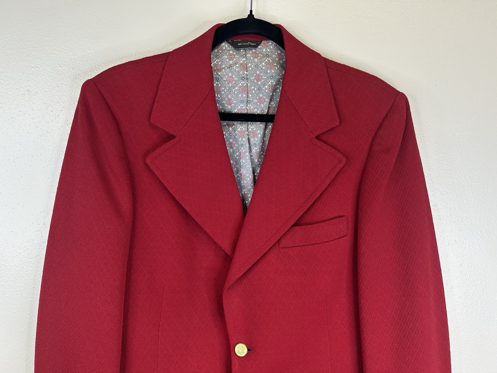 как выглядит Retro Vintage 1970s Red Polyester Blazer with Gold-tone Buttons 41 L Mens Suit фото