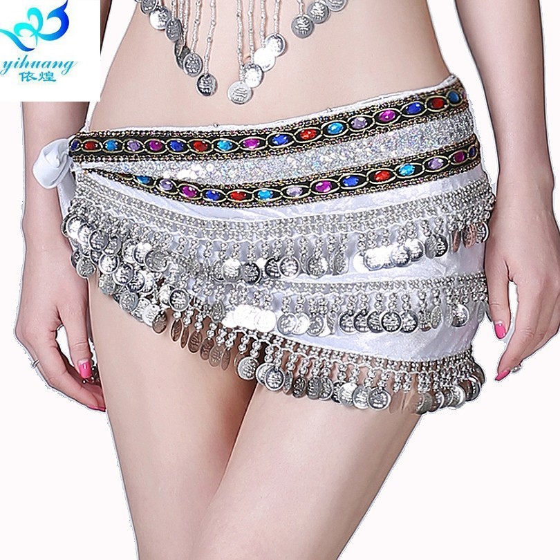KuJee White Belly Dance Hip Scarf Sequin Velvet Belt with Gold Coins