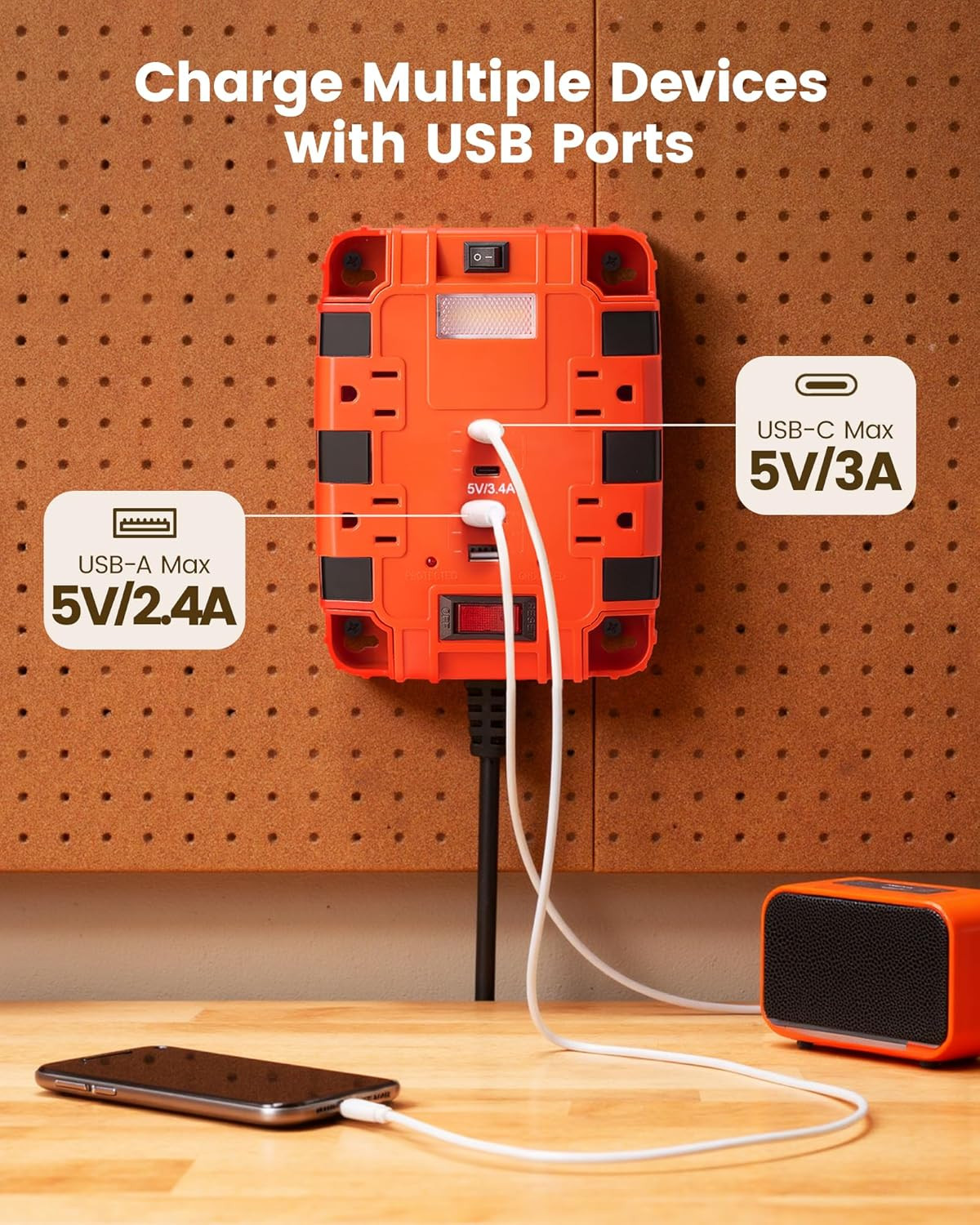 Magnetic Power Strip with 1080J Surge Protection, 4 AC Outlets, 2 USB-A 2 USB-