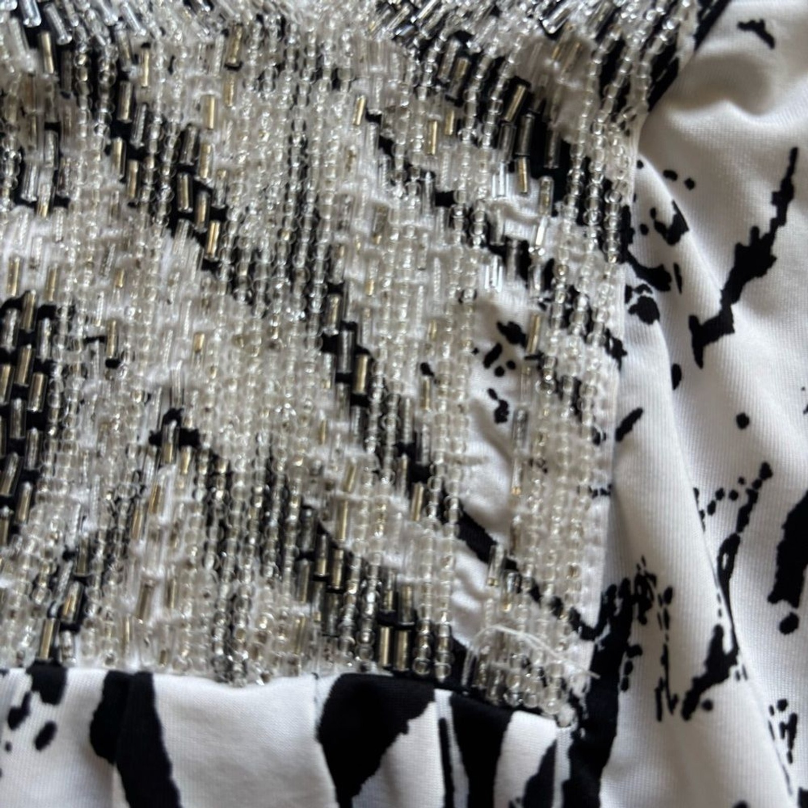 как выглядит INC International Beaded Abstract Print V-Neck Blouse Black White SP Petite фото