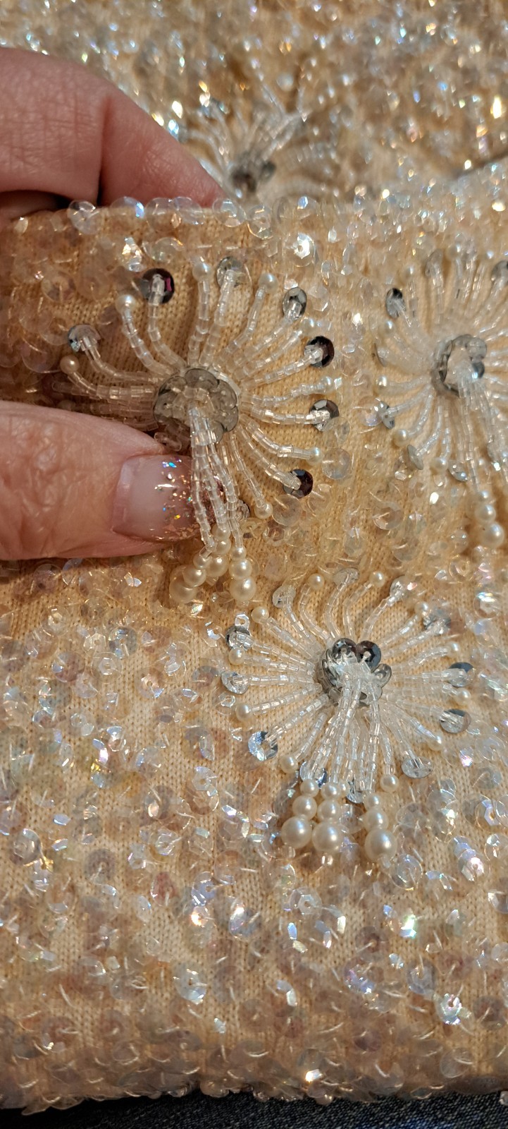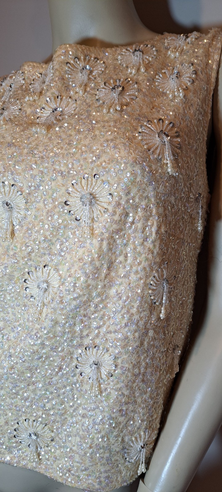 Vtg 60s Sequins Bead Shell Top Blouse 40 Hong Kong Large Fringe Off White