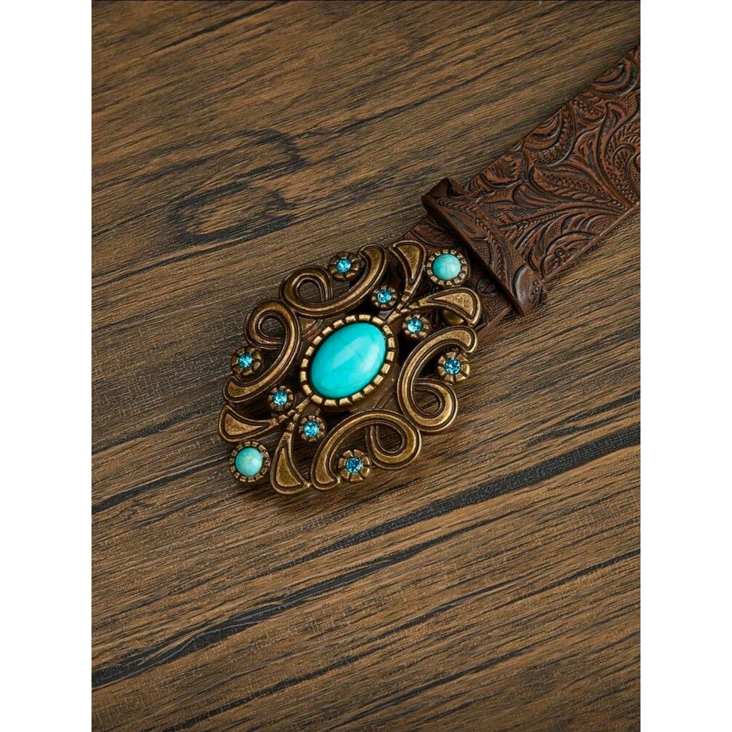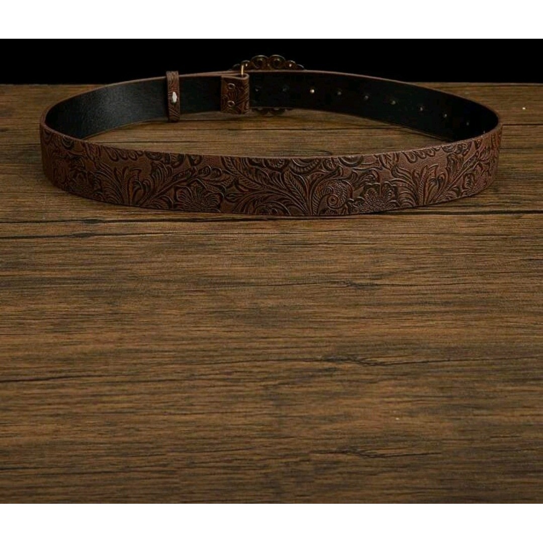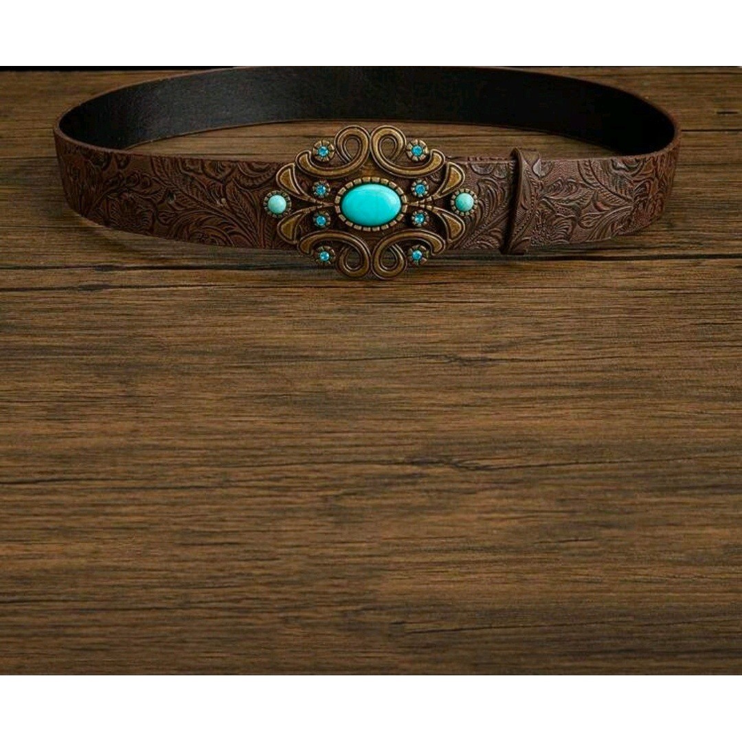 как выглядит Womens Western Turquoise Gem Belt Buckle Brown Leather Embossed Floral 44 inchs фото