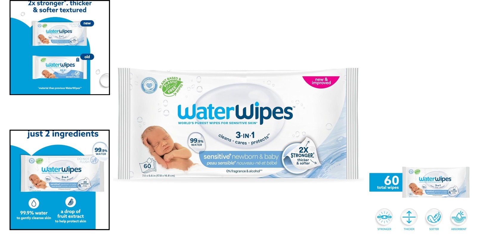 3-in-1 Sensitive Newborn Wipes - 99.9 Water, Plastic-Free, 60 Count
