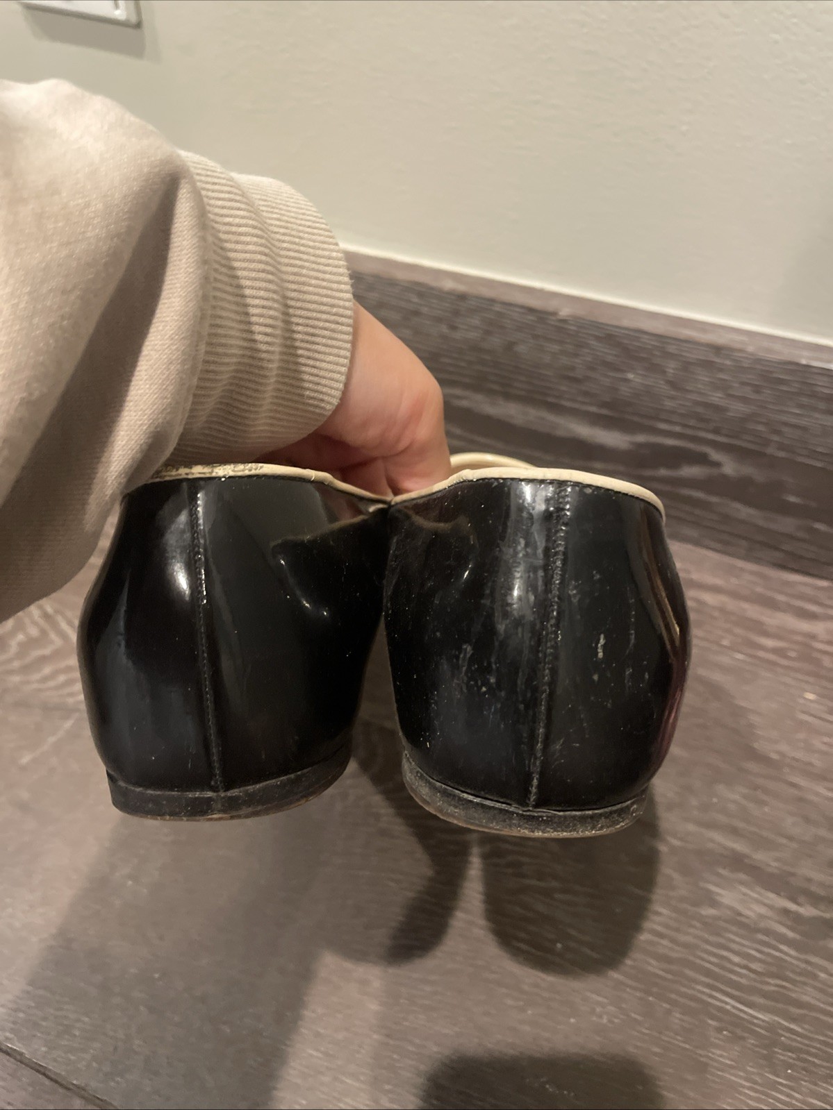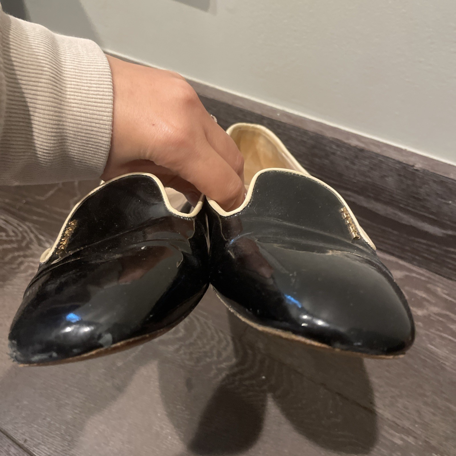 как выглядит PRADA Patent Leather Black Loafers Size 40 Women With Gold Logo фото