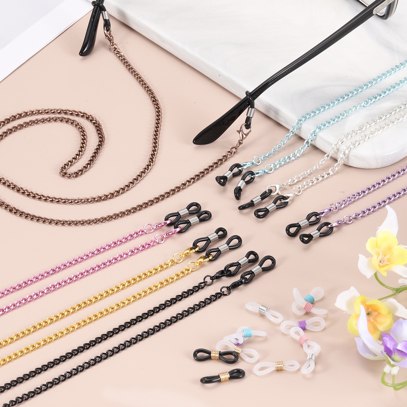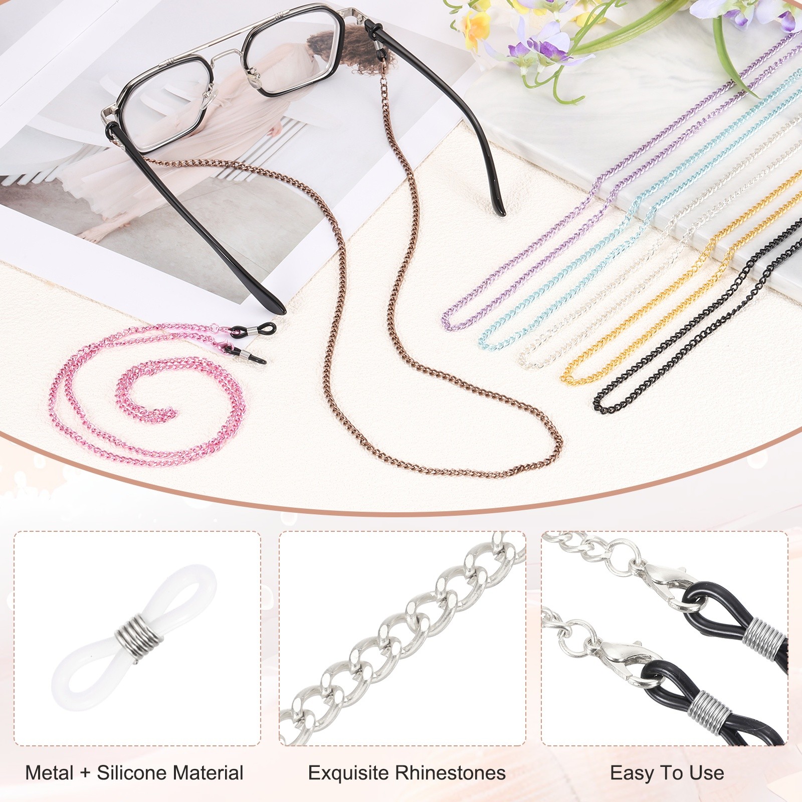 Glasses Chain, 75cm Metal Eyeglasses Strap with 6 Ends for Women, Silver