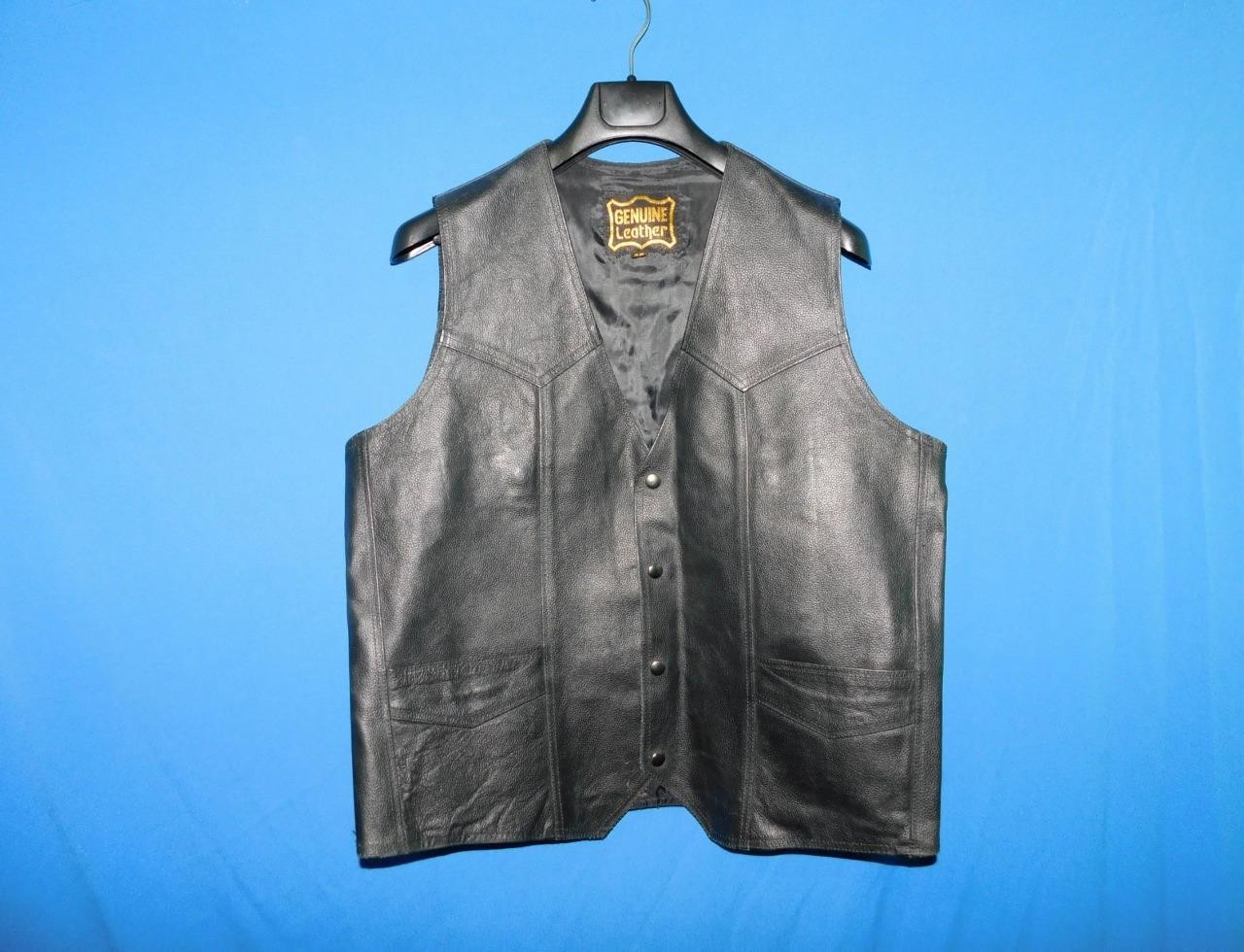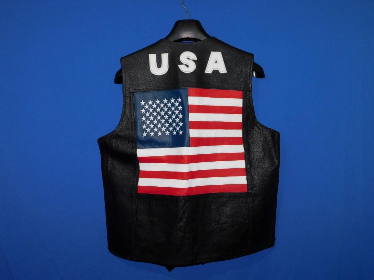 USA American Flag Black Leather Biker Vest Size 46 Snap Front Pockets Motorcycle