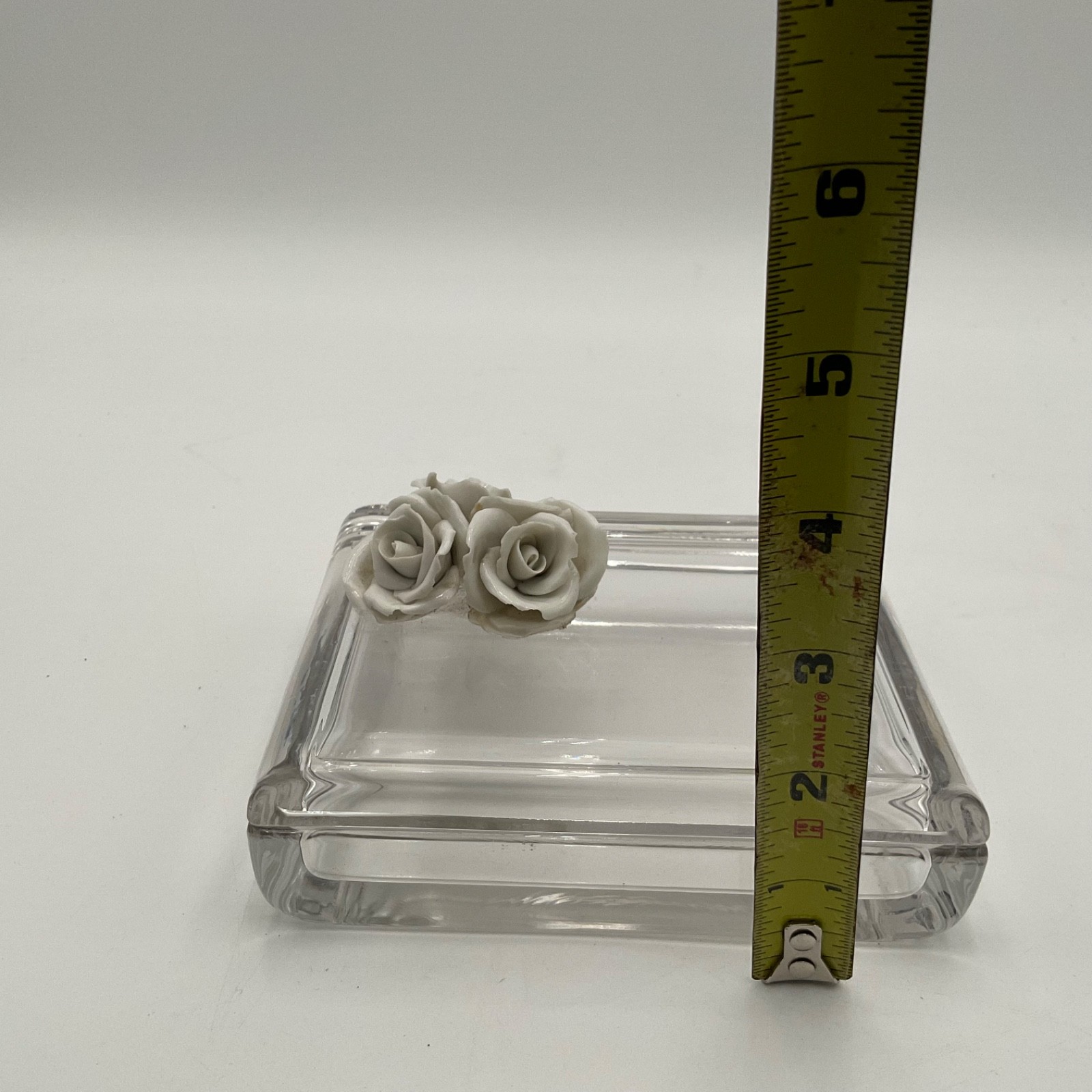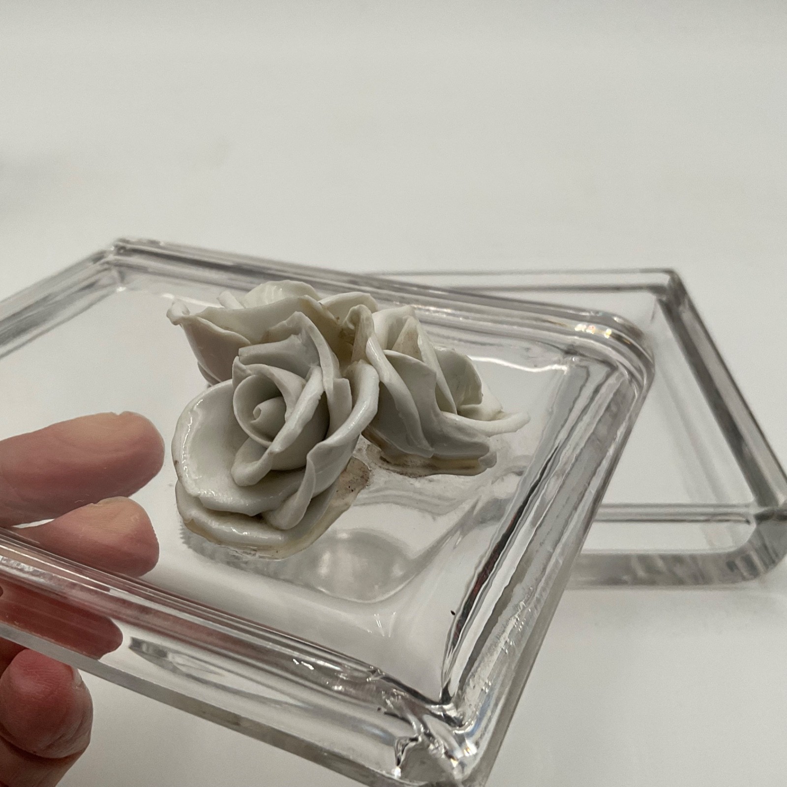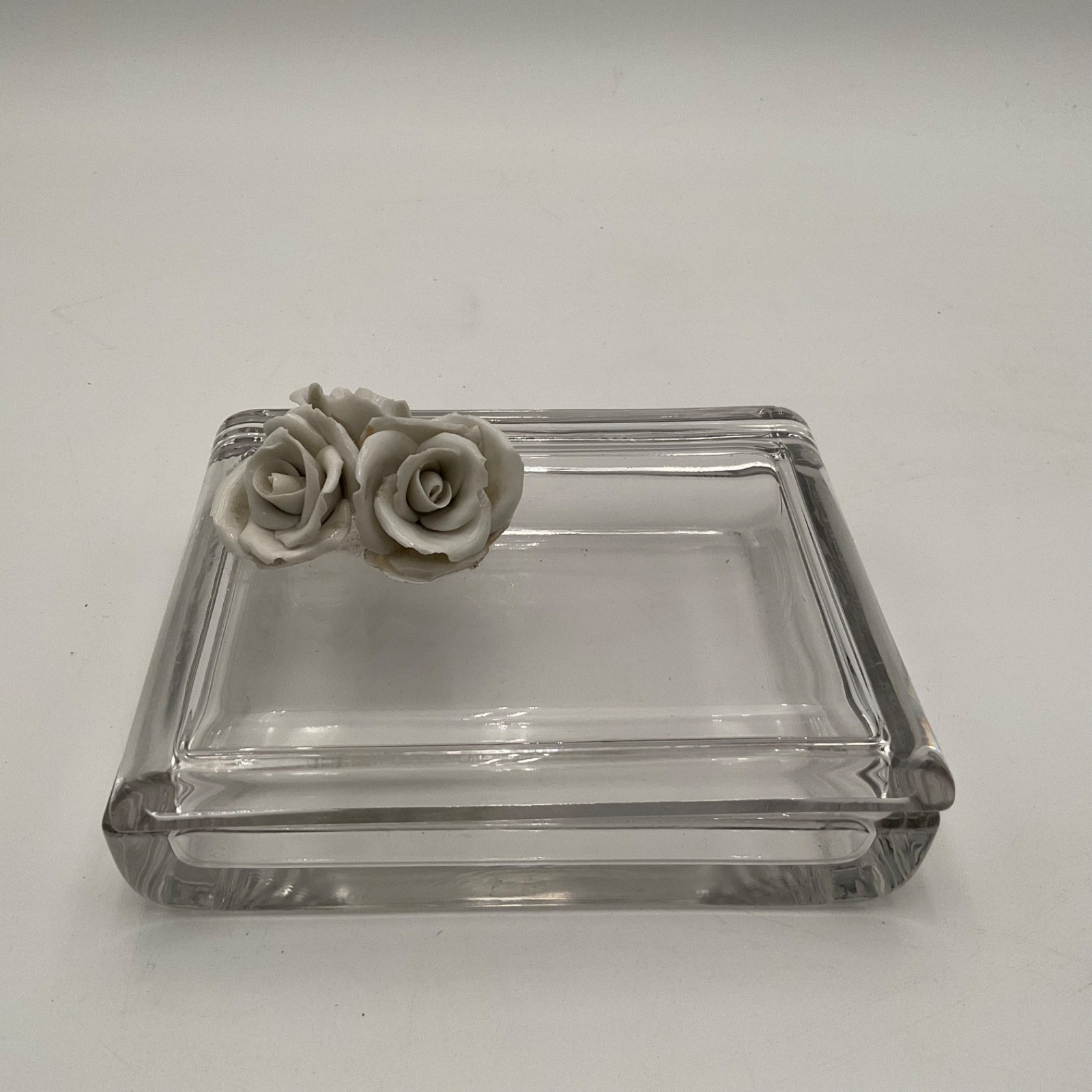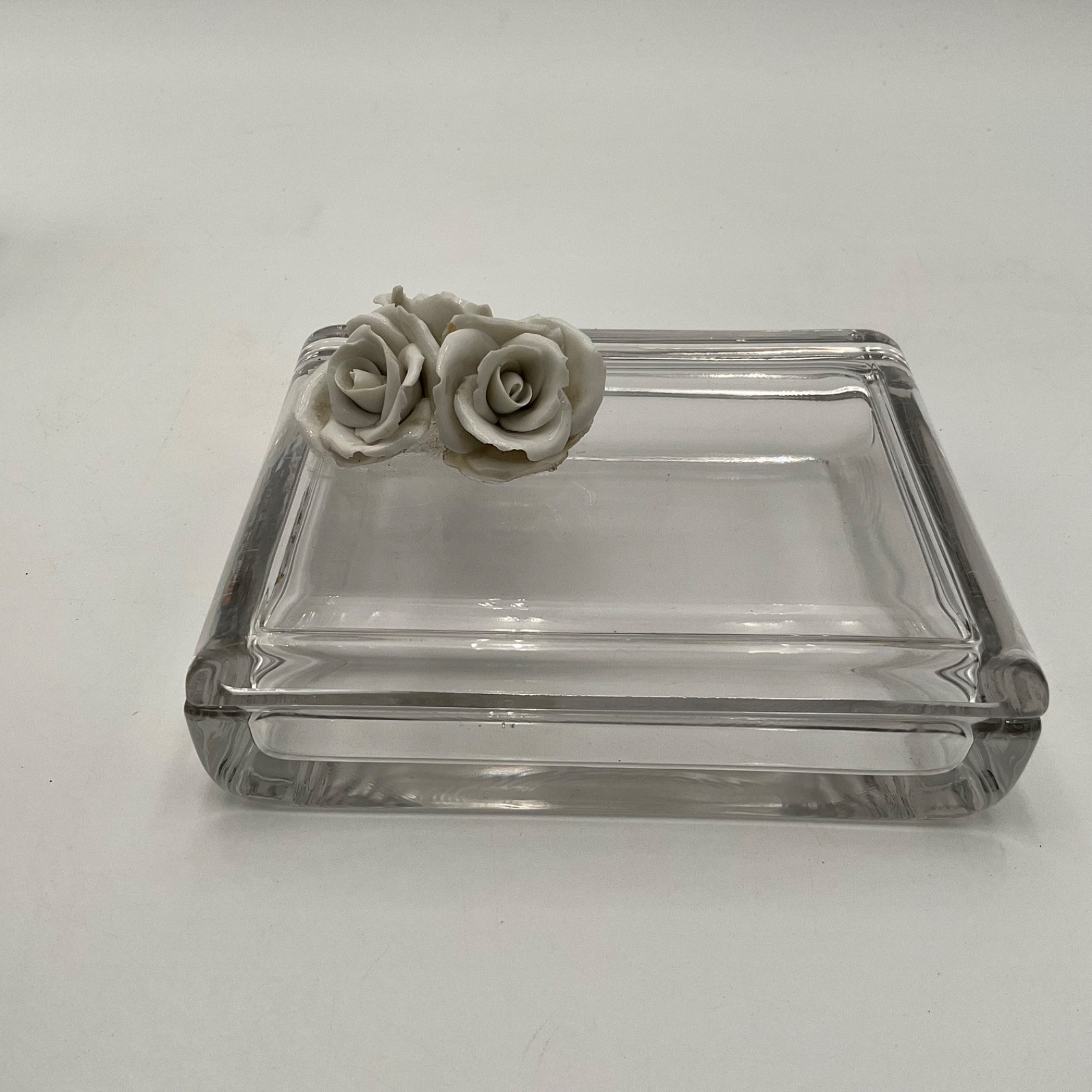 • Vintage Glass Trinket Box Porcelain Rose Lid Vanity Jewelry Box Mid Century