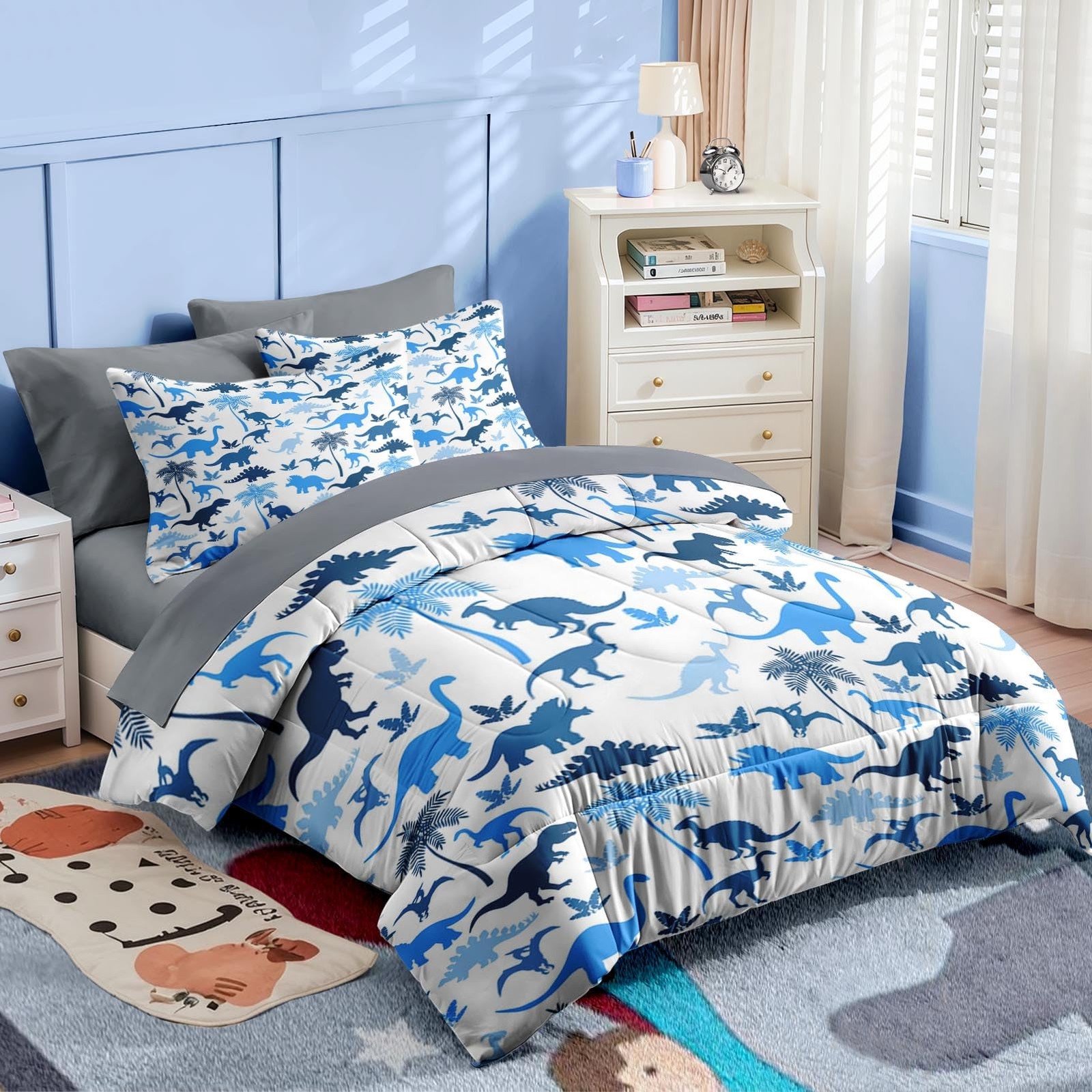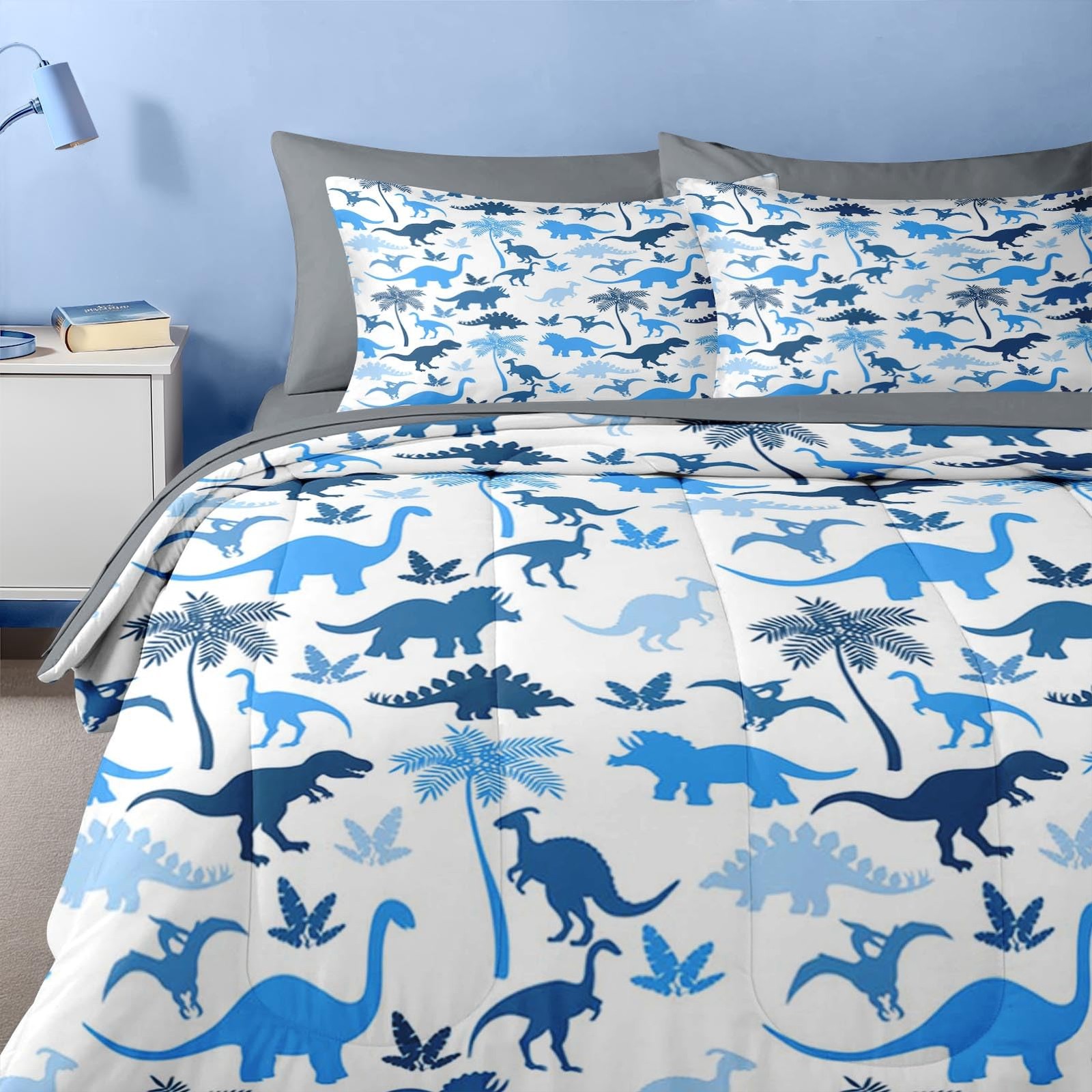 Comforter Set Queen Size, Blue Dinosaur 7 Pcs Bedding for Teens, Dino Palm Tr...