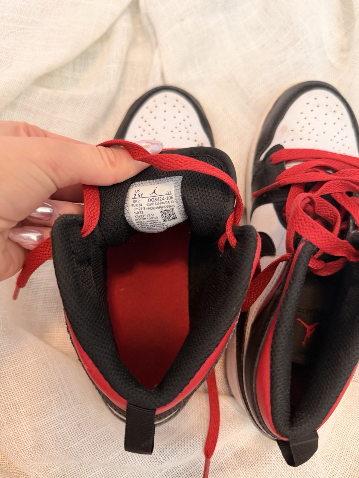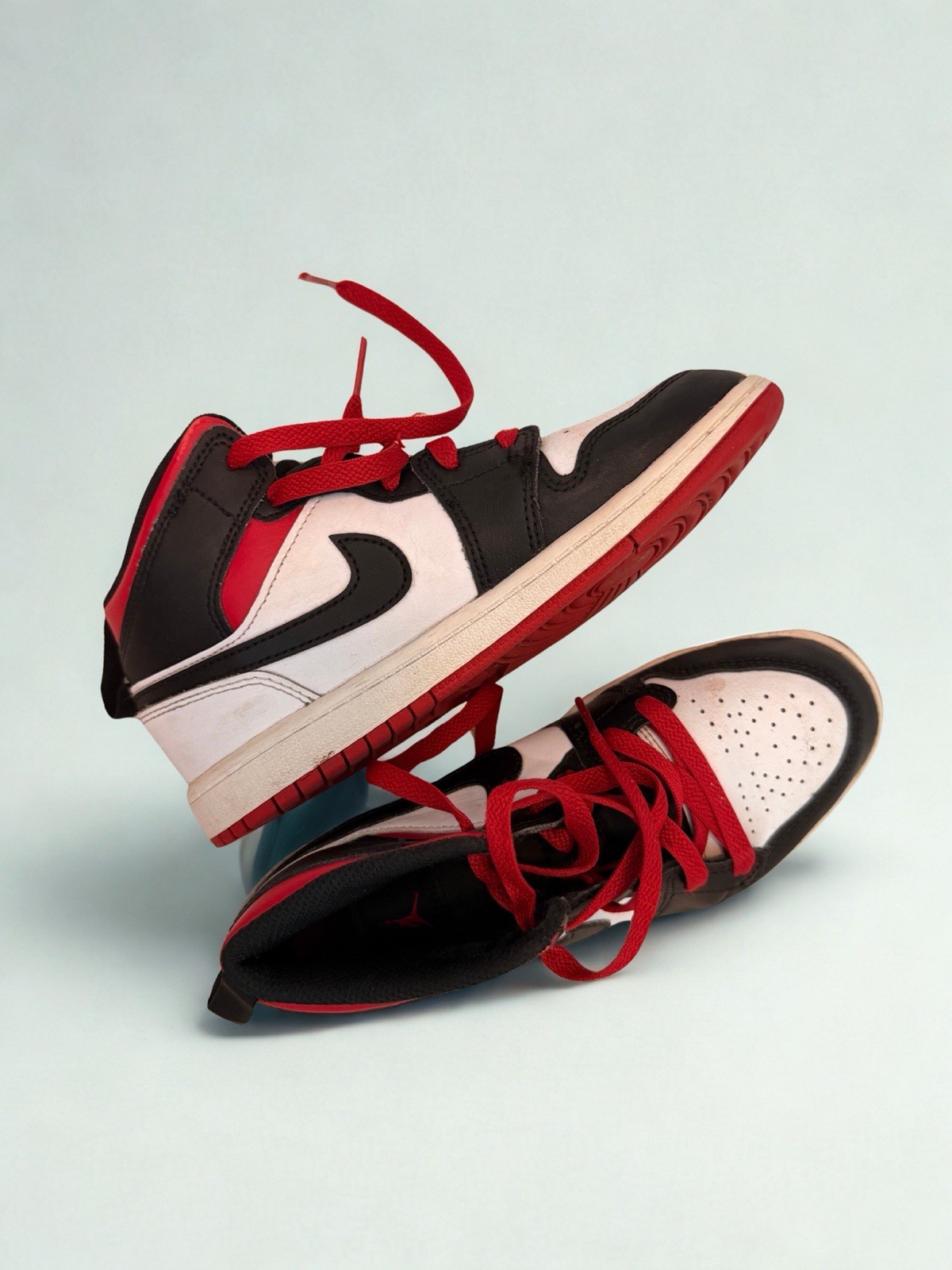 как выглядит Nike Air Jordan 1 Mid Kids Youth Size 2.5Y Black Red White  Pre-Owned фото