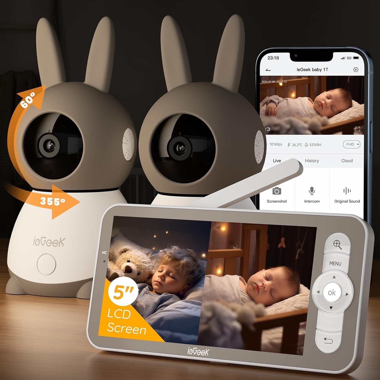как выглядит ieGeek 2K WiFi Baby Monitor with Two Camera, Phone App 5" Split-Screen Control фото