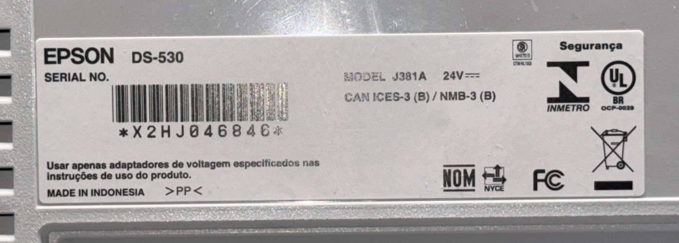 Epson DS-530, J381A, White, Color Duplex Document Scanner, 24V, Tested Working