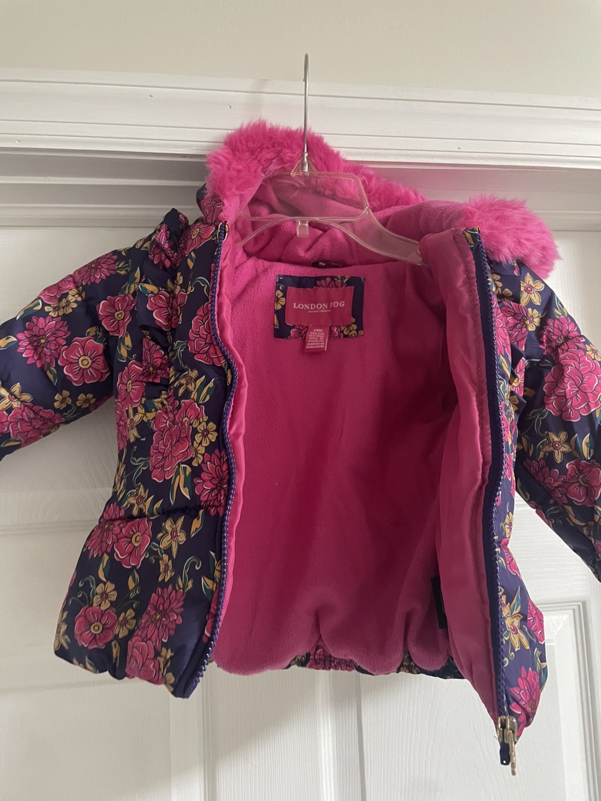 как выглядит London Fog Floral Coat with Fuchsia furry hood Toddler Girl Size 24 Months фото