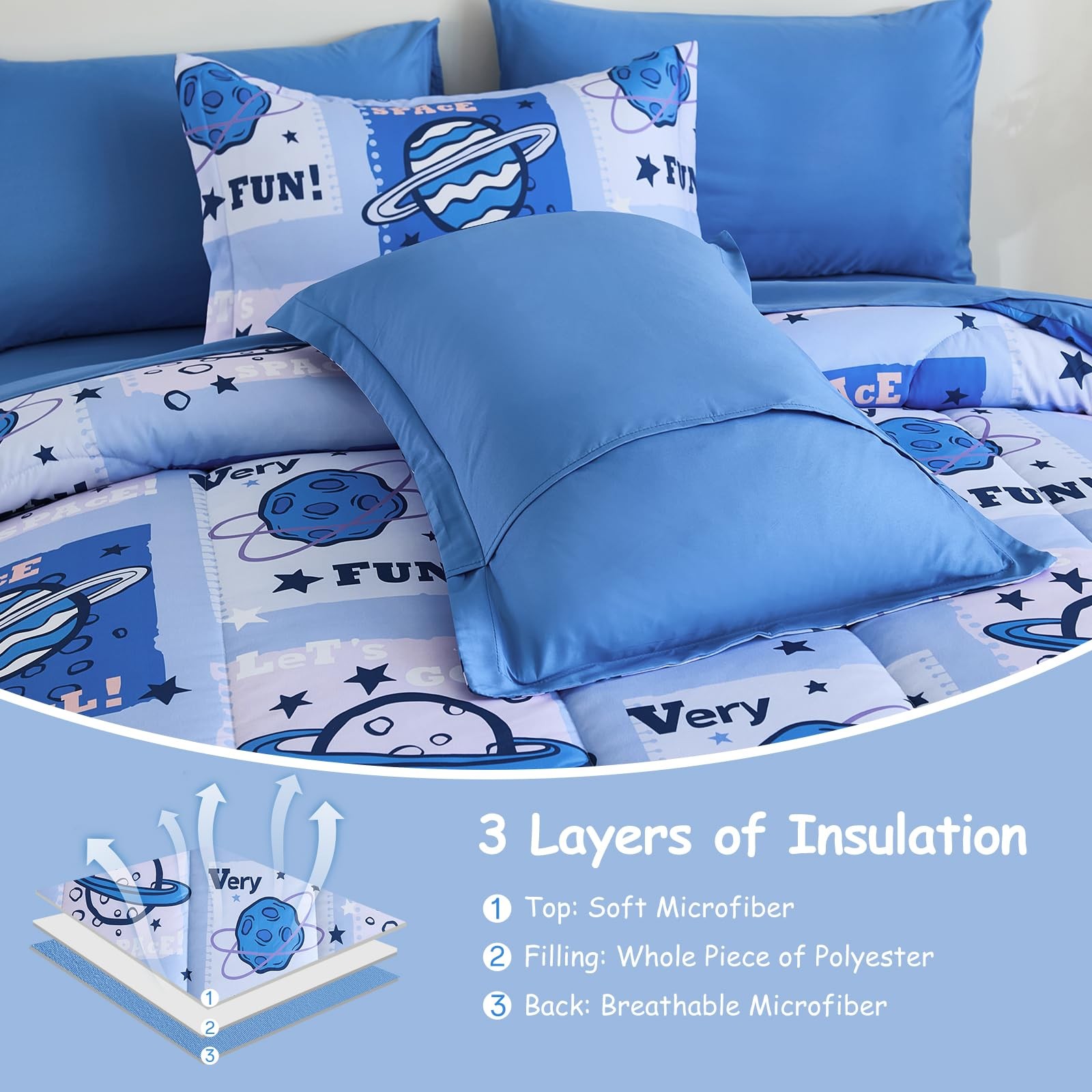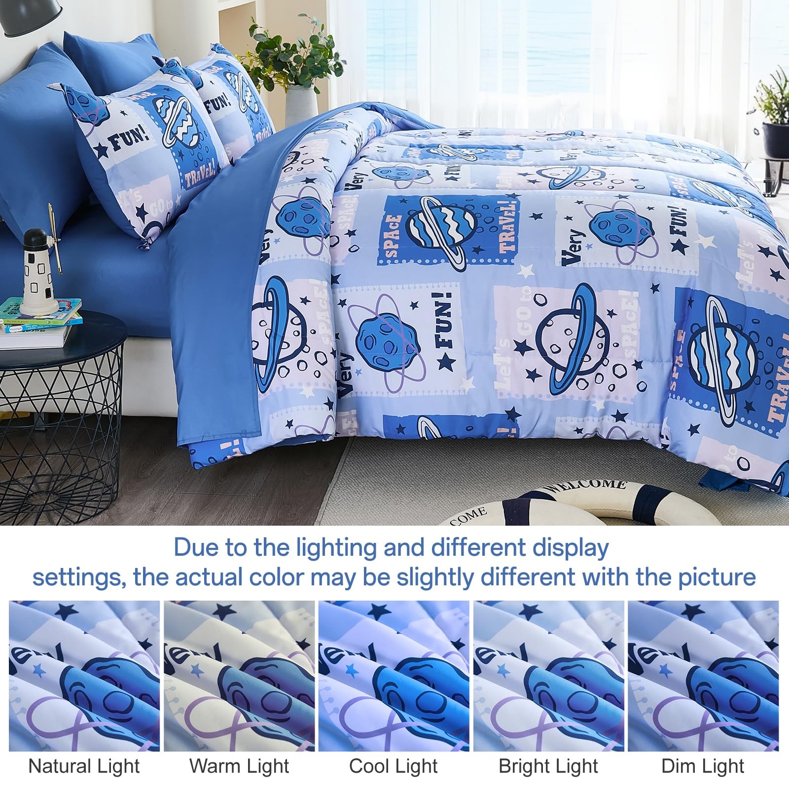 как выглядит Kids Space Comforter Set Bed in A Bag Queen Size 7 Piece Cartoon Planets Bedd... фото