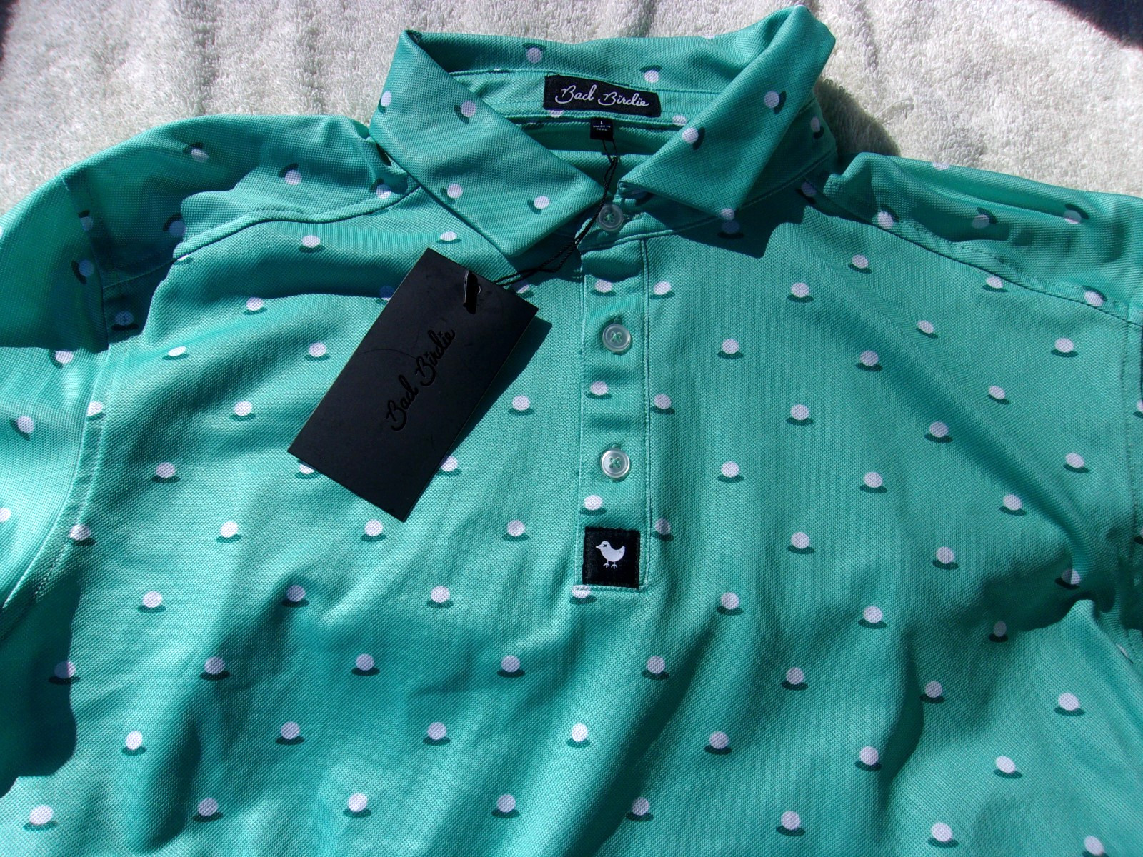 NWT Bad Birdie golf polo, men's L, pointed collar, green, golf balls print