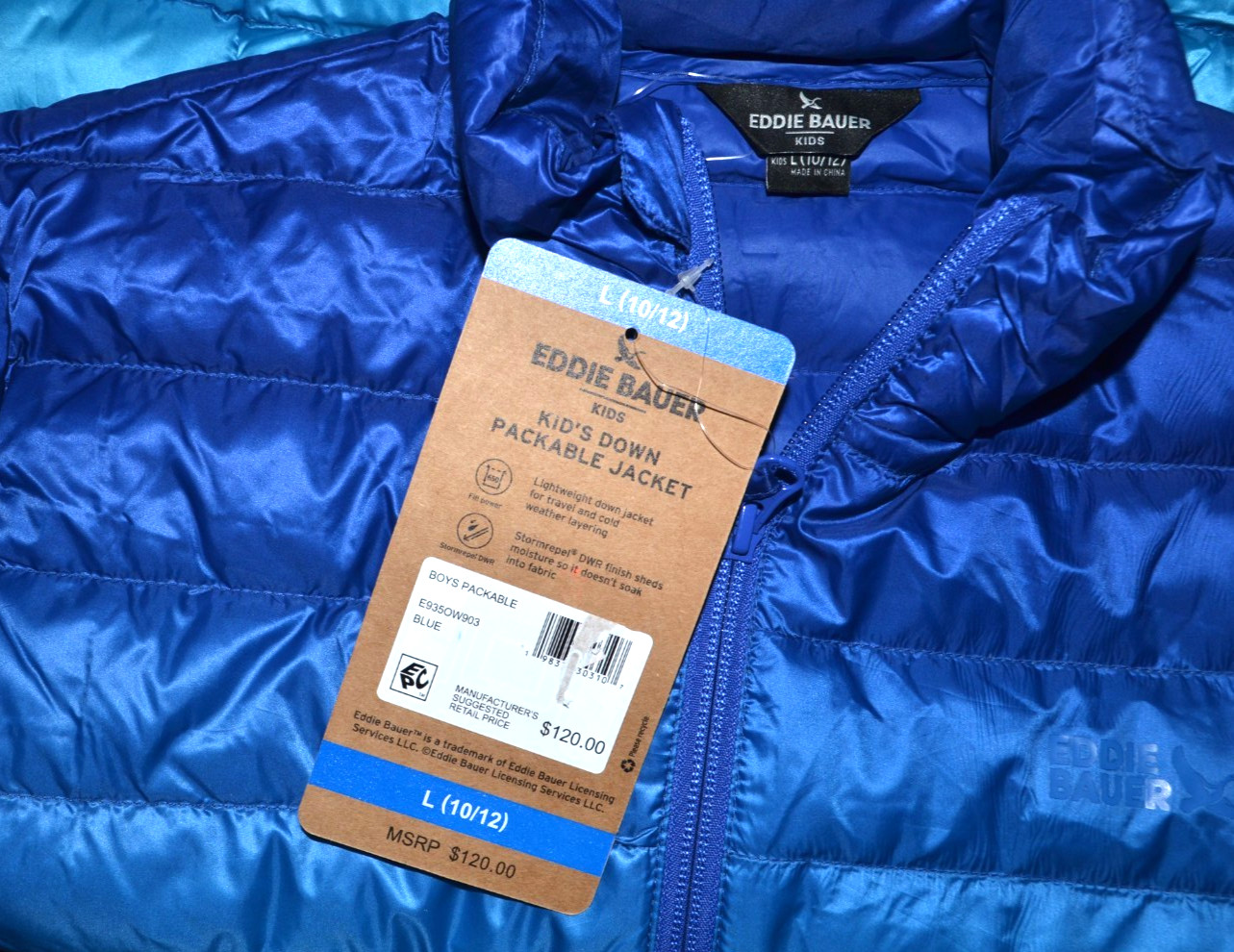NWT Eddie Bauer Boy's Down Jacket Lightweight Full-Zip Packable Sz. L 10/12