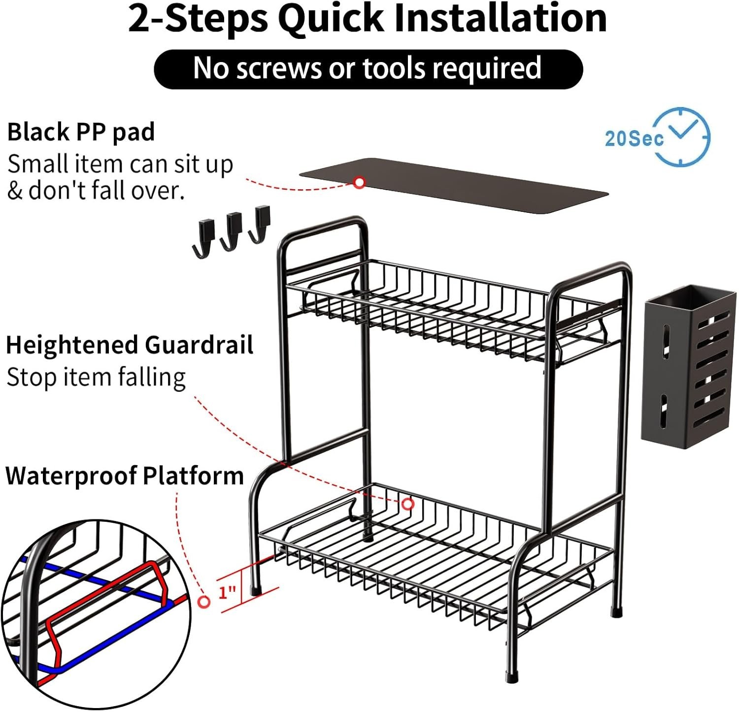 Organizador bano encimera 2 niveles metal negro con ganchos cesta especiero