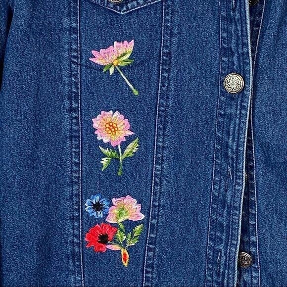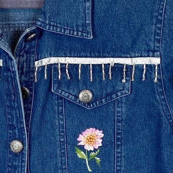 как выглядит Jean Jacket Floral New Identity Women SZ PM Blue Embroidered Beaded Long Sleeves фото