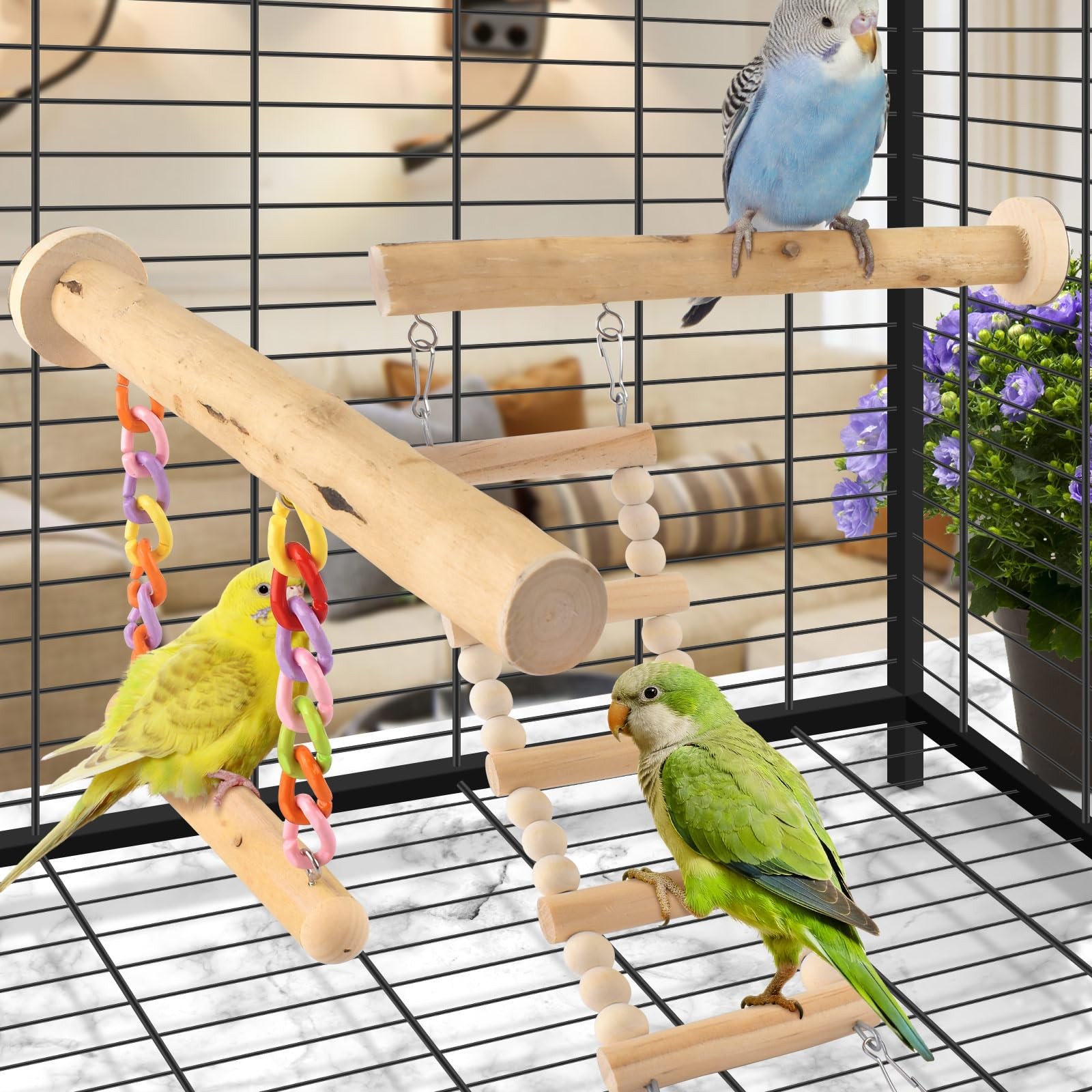 Included Components: 2 Pcs Bird Perches, Bird Ladder, Bird Swing